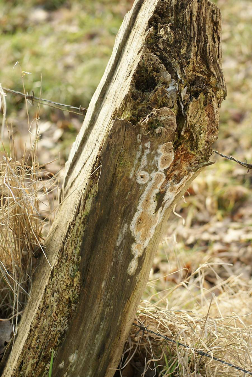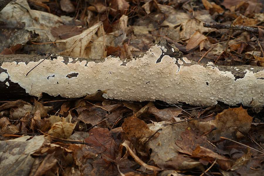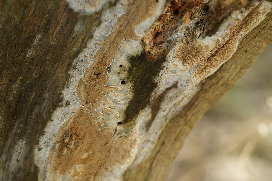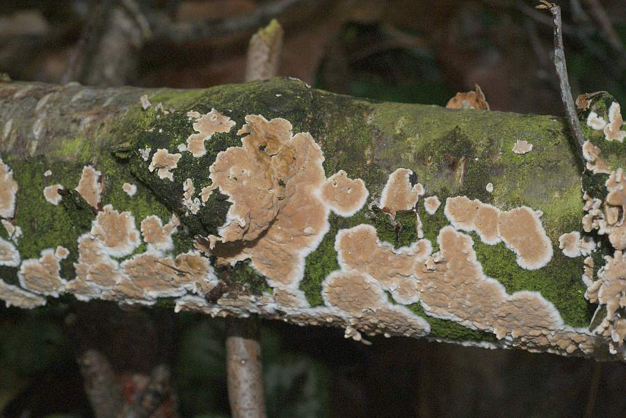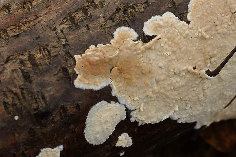 An einem liegenden Laubholz-Ast bemerkte ich resupinate Pilze von heller Farbe und einem Durchmesser von etwa 4 - 5 cm. Als ich mir den Ast fürs Foto zurechtlegen wollte, kam auf der Unterseite, dort wo der Ast am Boden lag, ein ca. 1 m langer Pilzbelag zum Vorschein - hier ein Ausschnitt: