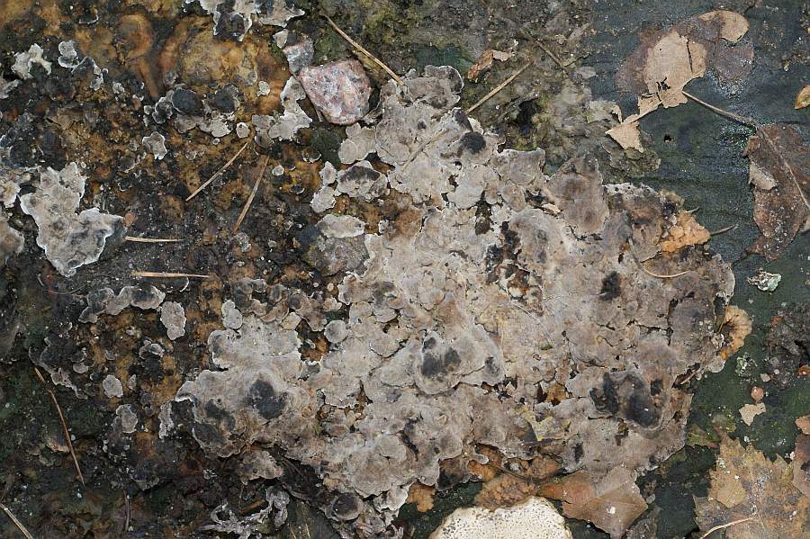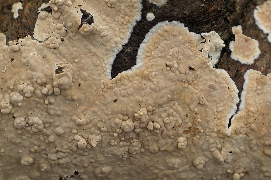 Auf der Stubben-Schnittfläche einer alten Buche wuchs neben Buckeltramete, Schmetterlingstramete, Geweihförmige Holzkeule auch dieser unscheinbare Pilz. Resupinat mit starker "Höckerbildung". Farbeindruck gesamt = grau, differenziert betrachtet auch bräunlich und mit Violettanteilen, oben auf den Höckern schwarz (vielleicht von Berührungen?), in Randbereichen weißlich gerandet.