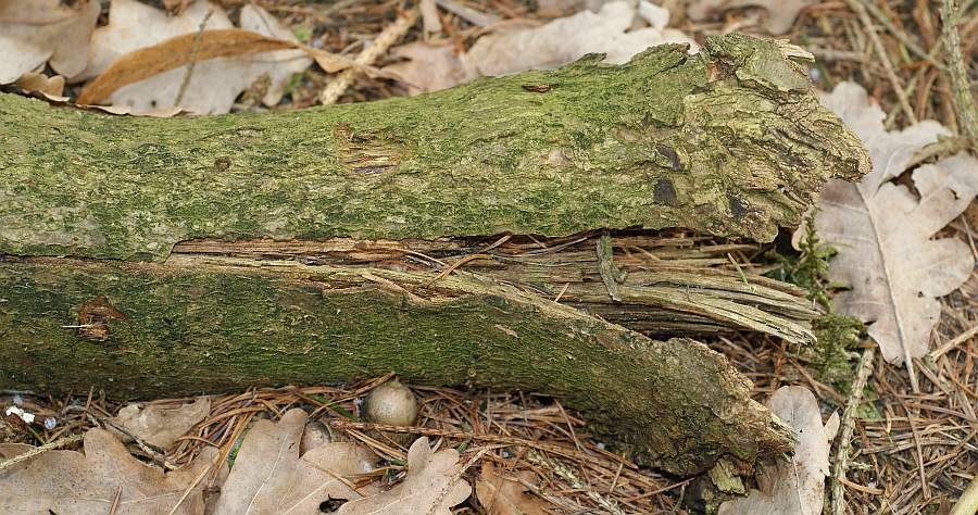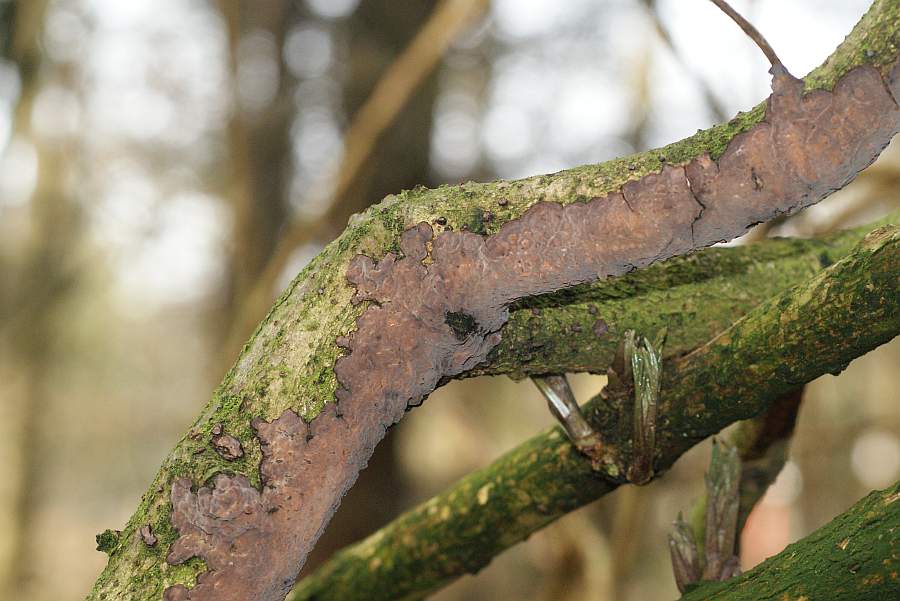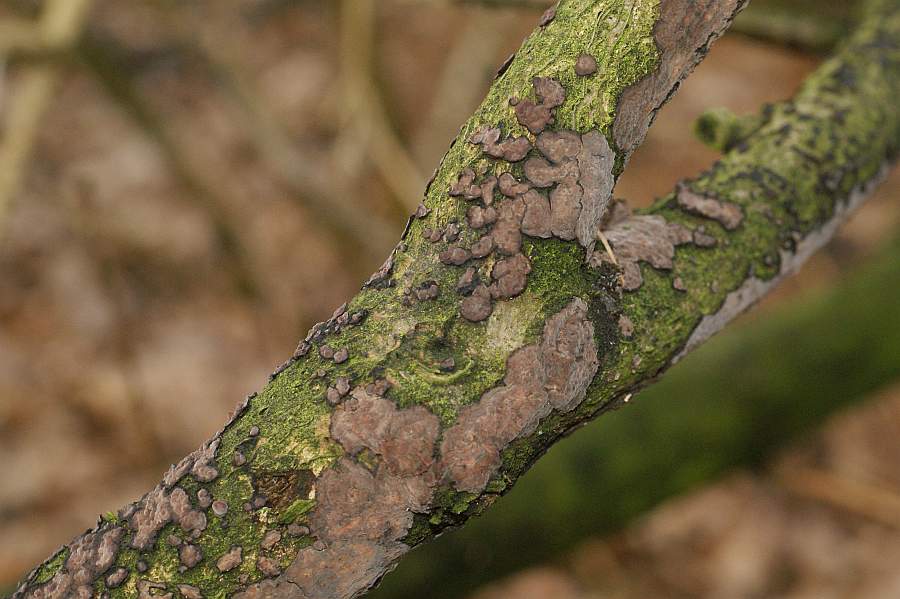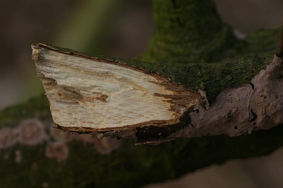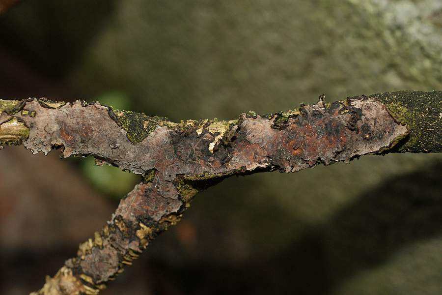 Dieser lilafarbene Pilz wuchs an einem unberindeten Ast eines Schwarzen Holunders (Bilder 1 und 2). Er scheint auch auf anderen Laubhölzern zu wachsen. An den Rändern ist er etwas abgehoben vom Substrat, und man kann ihn wie einen Schorf abziehen. Er scheint Wirte zu bevorzugen, deren Rinde bereits weg ist und schon Moos angesetzt haben. Genauso habe ich ihn neulich auch gefunden (Bild 3).