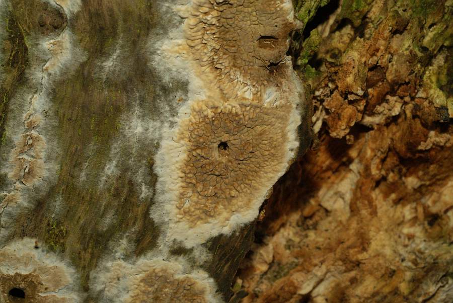 Der Pilz wuchs voll resupinat und die Oberfläche war schokoladenbraun, am Rand beigefarben. Um Löcher im Holz sind regelmäßige, sehr dicht beieinander liegende Wülste erkennbar, die sich fast konzentrisch um das Loch herum gebildet haben. Wo keine Löcher im Spiel sind, wächst der Pilz auch flächiger. Keine Farbveränderung beim Drücken.
