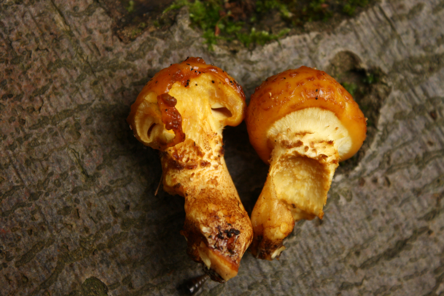 Das Fleisch war im Schnitt hellgelb - falls das was zu sagen hat. Der Geschmack ist pilzig und die rotbraunen Flocken schwimmen im Schleim der Huthaut. Wie gesagt wuchsen sie aus der Schnittfläche eines mächtigen liegenden Buchenstammes.@Pablo: Danke für deine kurze Erklärung, vielleicht komme ich ja noch dahinter und wenn nicht ist's auch egal. Muss ja nicht alles verstehen...
