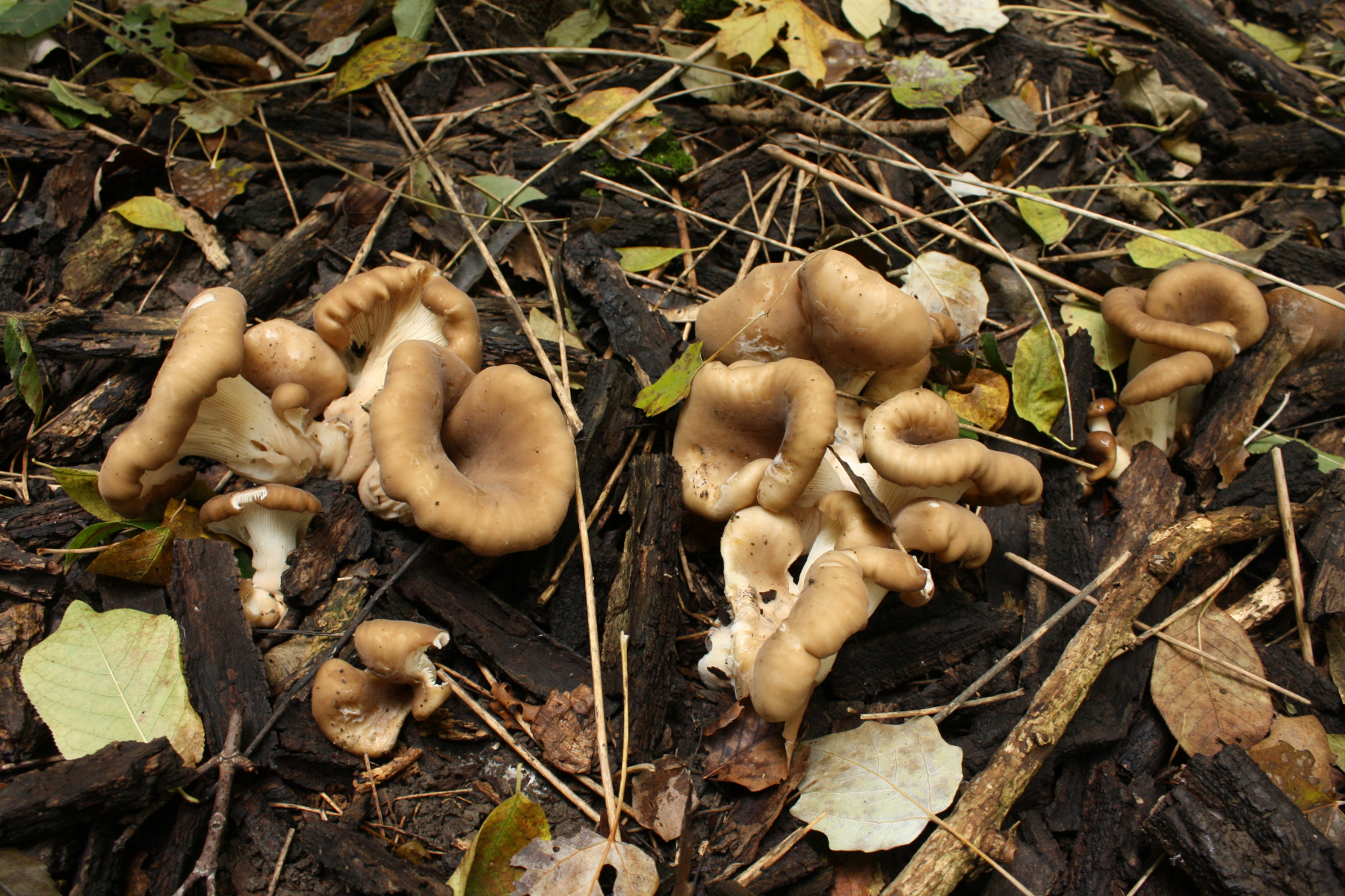 Ich hab zwar kein Foto, wo die Pilze auf diesem Boden zu sehen sind, aber eines, wo drauf ist, wie es dort ausgesehen hat. Sie wuchsen eher vereinzelt, doch mit einem Abstand von ei paar Zentimetern. Der Geruch ist in der Wärme jetzt doch leicht pilzig. Die Lamellenschneiden sind weiß, etwas heller als die Lamellenfläche, die etwas gräulich ist. Milch gibt er keine, der Stiel ist innen hohl. Hab jetzt beim nochmaligen Begutachten gesehen, das am Myzelfilz an der Stielbasis bei einem kleine Holzstückchen dran sind.