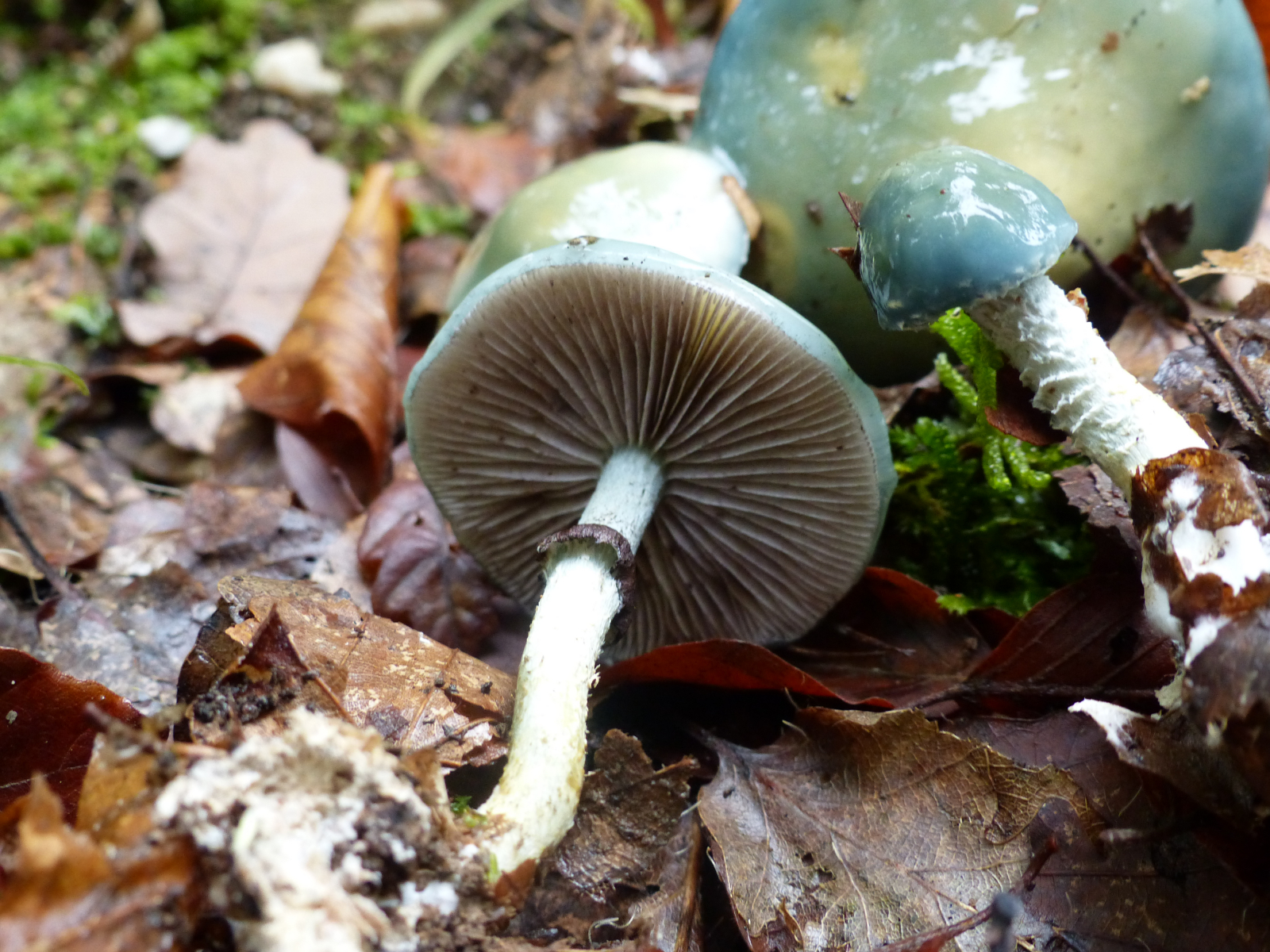 Farbe des Hutes: dieses typische Grünblau, ausgeblaßte Stellen, weil Laub drauflag,