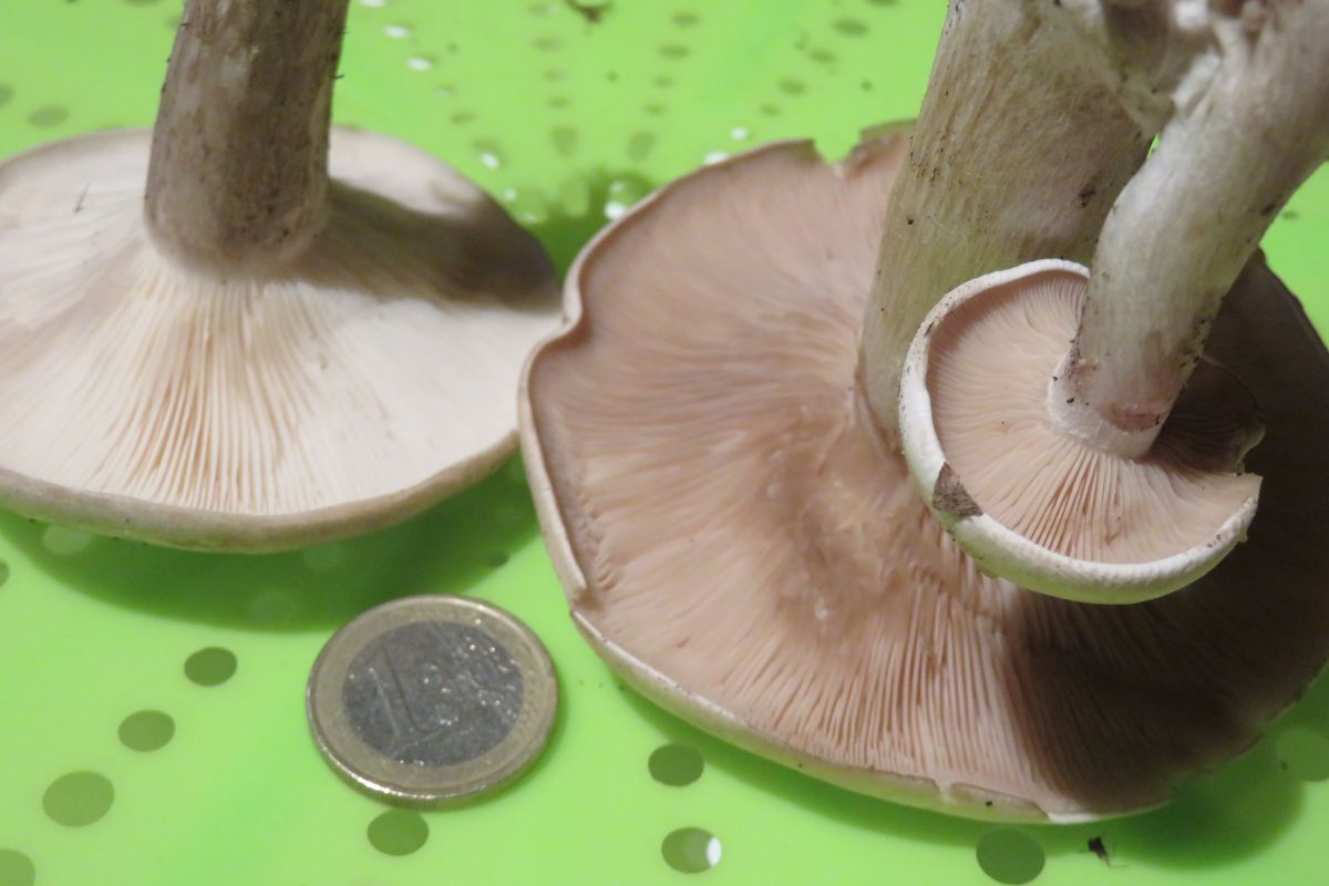 Pilz rechts: Lamellen ausgebuchtet angewachsen, auch verschiebbar, hell rosa-bräunlich. Geschmack: nicht probiert.