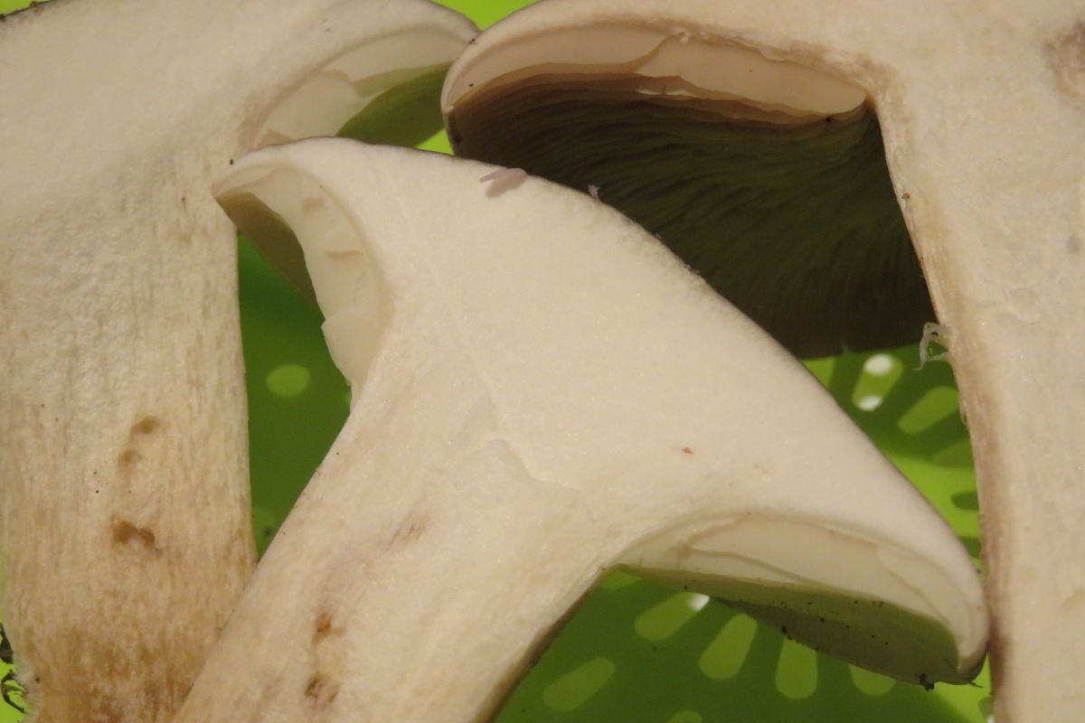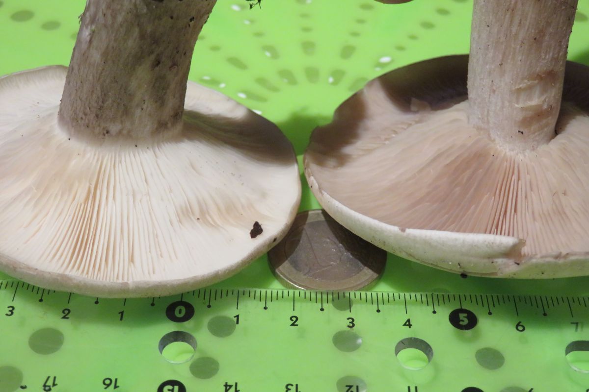 Pilz links: Lamellen angewachsen, leicht herablaufend, verschiebbar, weisslich. Geschmack: Richtung "süßlich-mehlig", nicht unangenehm.