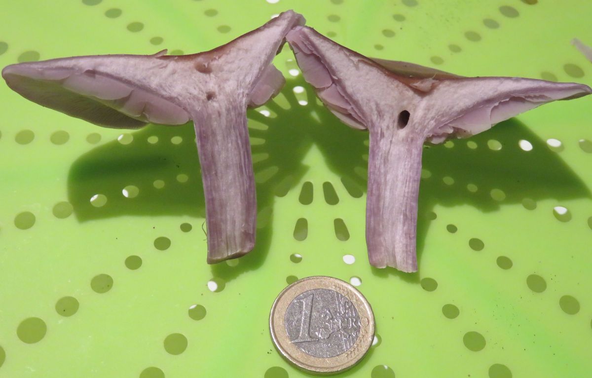 Wenn Lepista nuda irgendwie etwas zu klein ist und eher schmächtig und dabei eben nicht nach lepista nuda riecht, dann ist es eine lila Farbvariante von Lepista sordida (Schmutziger Rötelritterling). Wir hatten vorgestern einen solchen Fruchtkörper, du erinnerst dich?