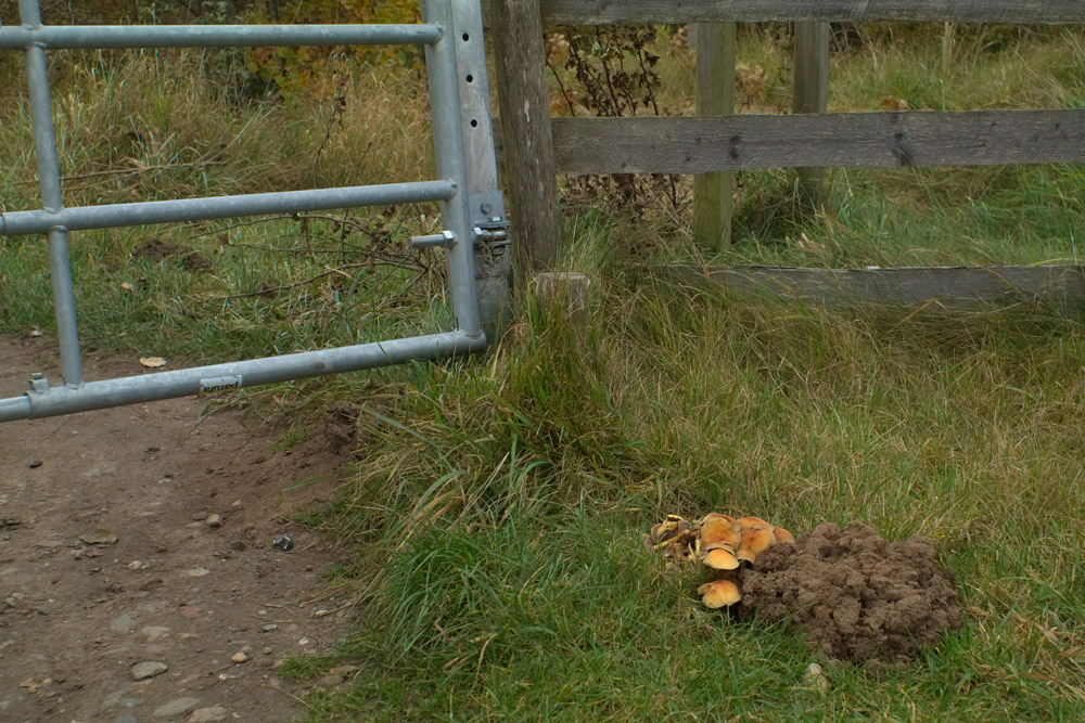 Wenig, direkt am Wegrand im Gras an einem baumfreien Stück. Was man rechts sieht, die Erde, ist ein Maulwurfshaufen.
