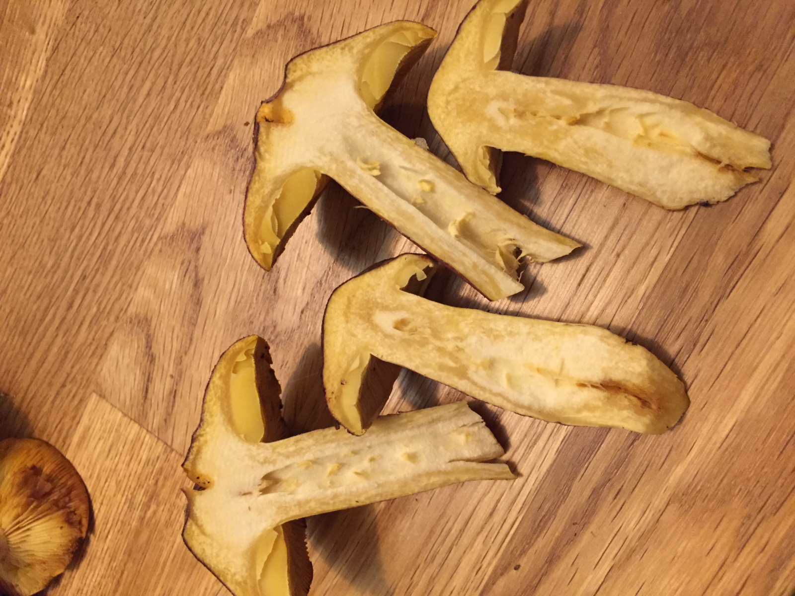 Auffällig ist die intensiv gelbe Lamellenfarbe, Rot/Braune samtige Kappe und der rot/braune Stiel. Das Fleisch ist komplett intensiv gelb. Geruch ist äusserst angenehm plizig/erdig.