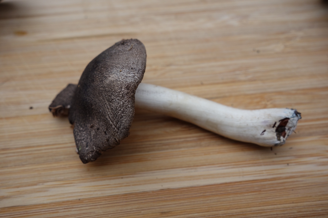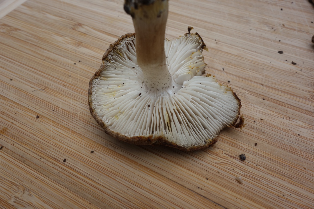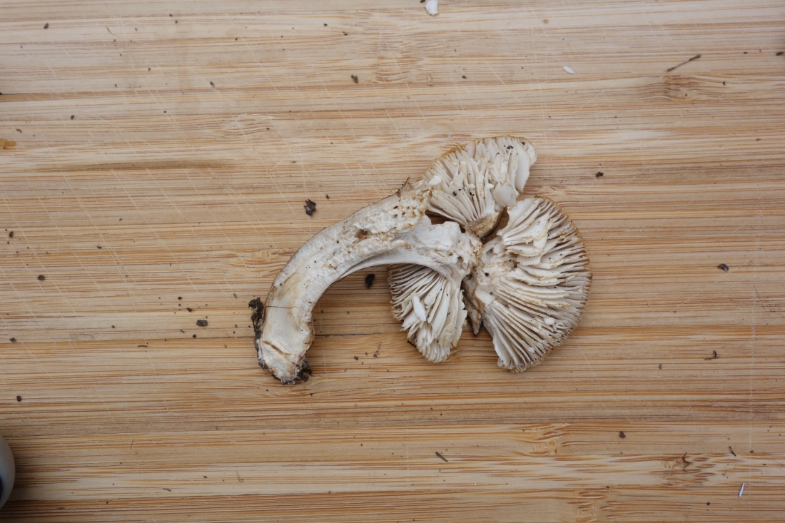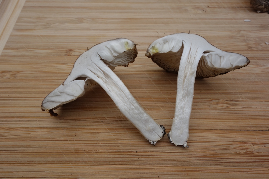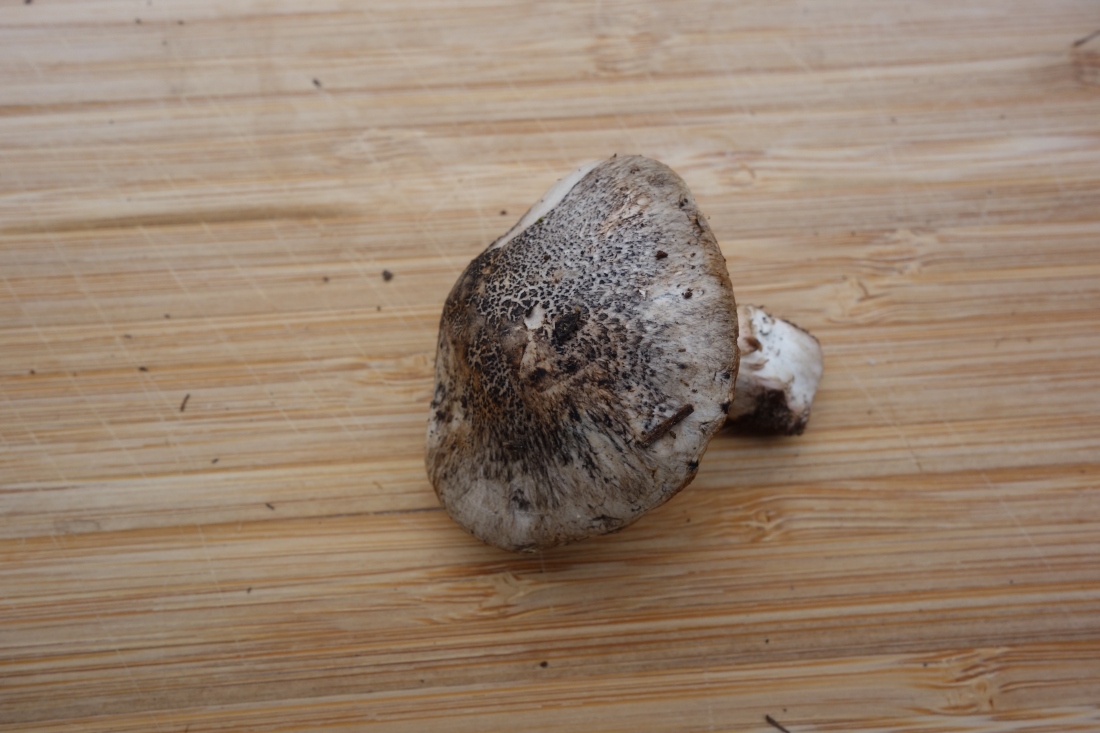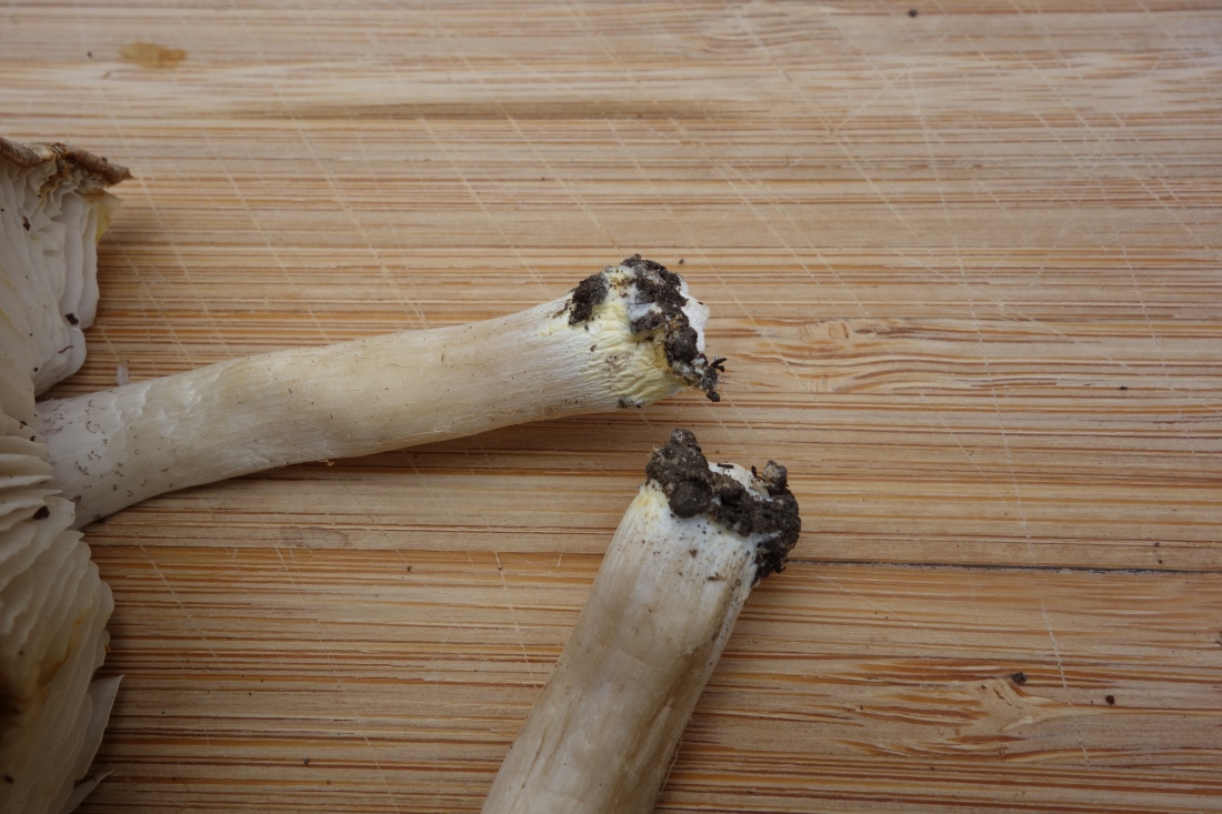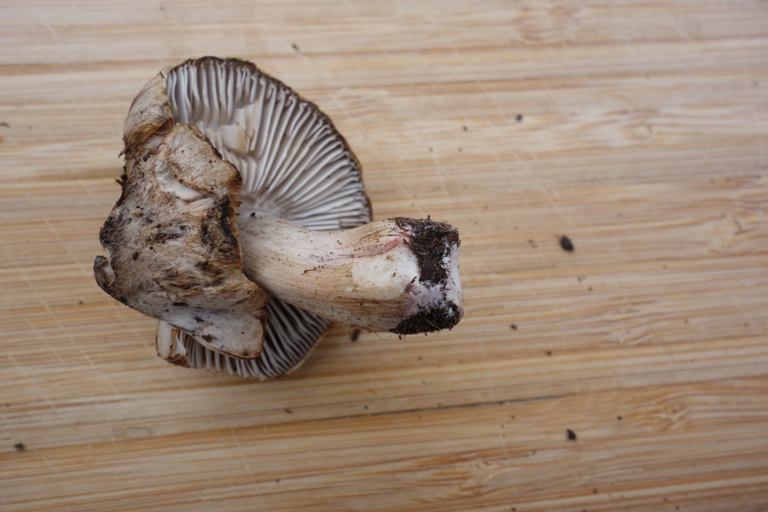 7) Dieser Fund landet unter der Annahme im Korb es sei vermutlich die gleiche Art wie Pilz 6. Zu Hause bemerkte ich dann jedoch Unterschiede. Der Geruch war zunächst nicht mehlig, im Schnitt trat dann aber eine Mehl-Note zutage. Der Geschmack war kräftig mehlig und mild. Nach einer Nacht im Warmen wies der Fruchtkörper jedoch eine merkliche rötliche Verärbung an der Stielbasis auf die mir Tags zuvor nicht aufegfallen war. Nach einem weiteren halben Tag ist nun der gesamte untere Bereich des Stiels leicht rötlich angelaufen. Ich bin daher versucht diesen Fund T. basirubens zu benennen.
