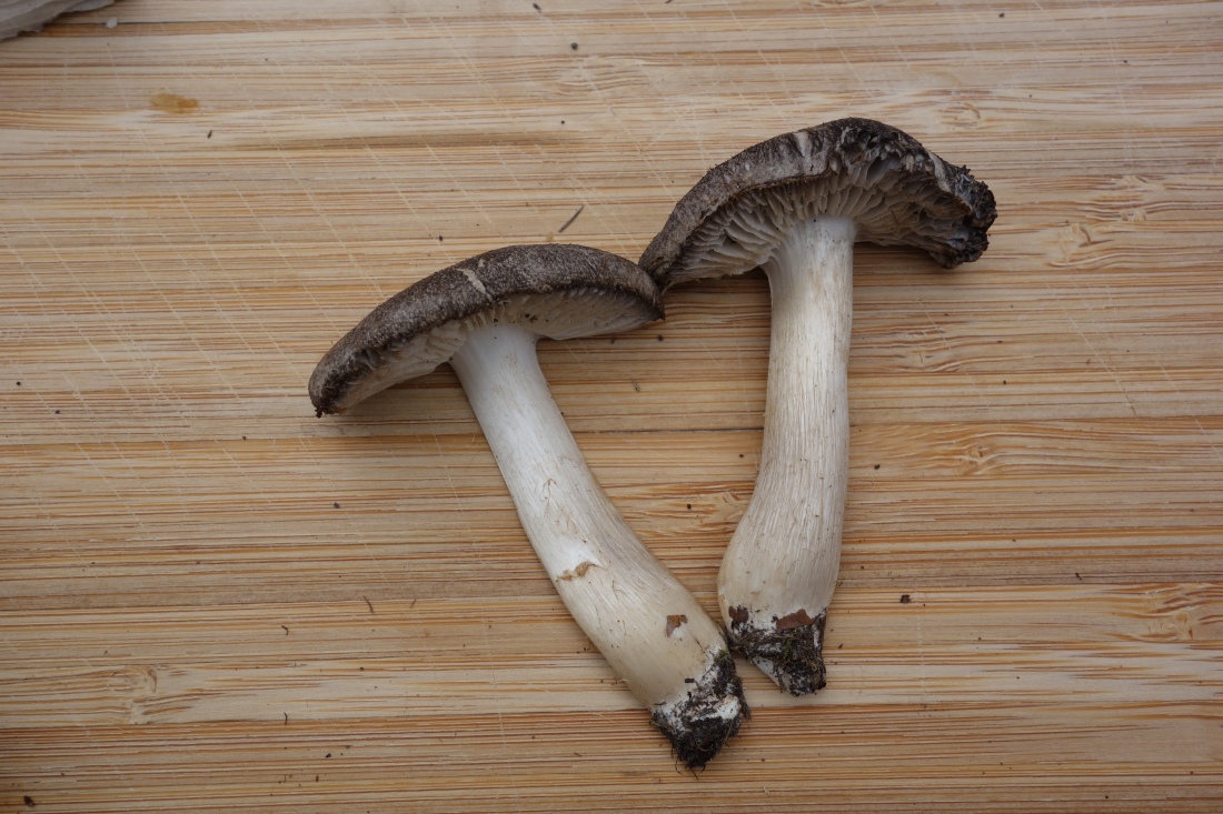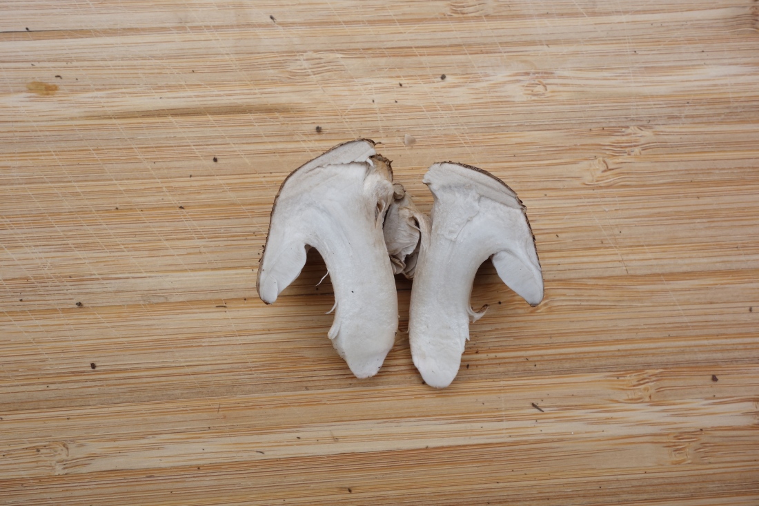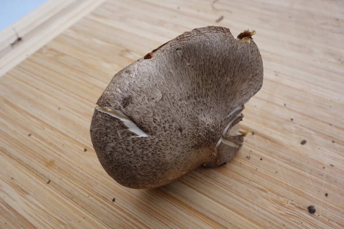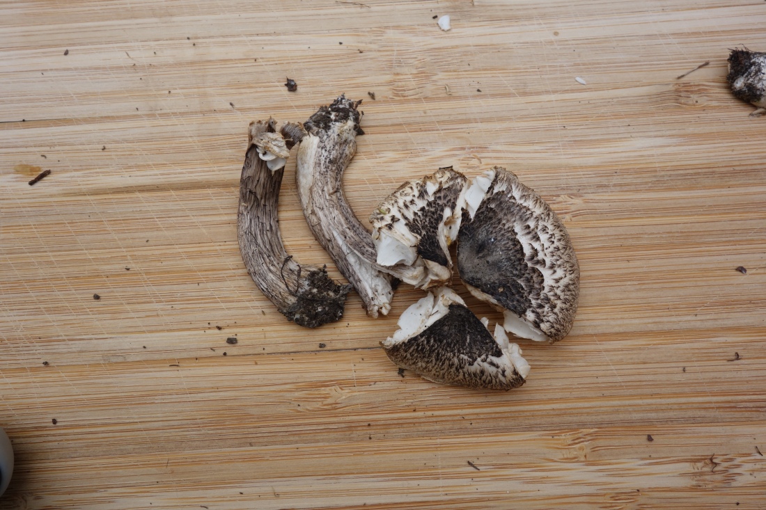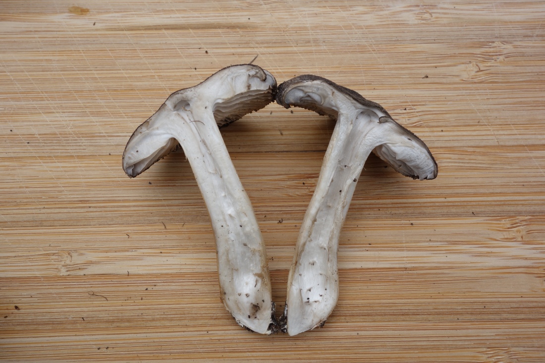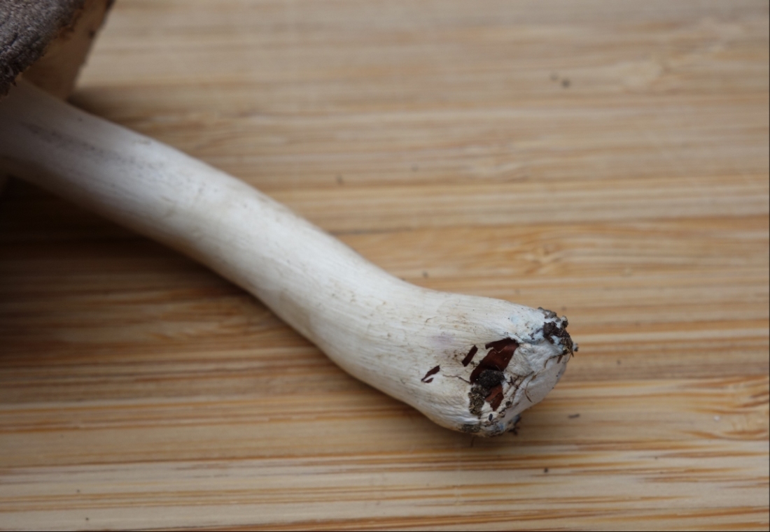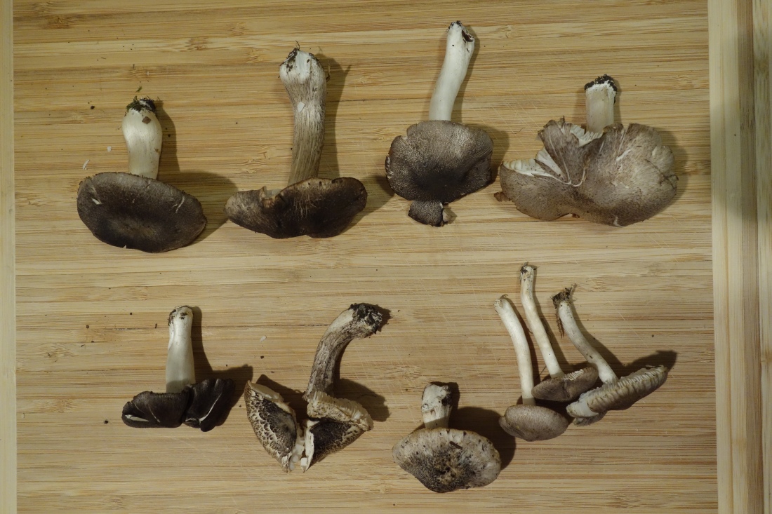 7) Dieser Fund landet unter der Annahme im Korb es sei vermutlich die gleiche Art wie Pilz 6. Zu Hause bemerkte ich dann jedoch Unterschiede. Der Geruch war zunächst nicht mehlig, im Schnitt trat dann aber eine Mehl-Note zutage. Der Geschmack war kräftig mehlig und mild. Nach einer Nacht im Warmen wies der Fruchtkörper jedoch eine merkliche rötliche Verärbung an der Stielbasis auf die mir Tags zuvor nicht aufegfallen war. Nach einem weiteren halben Tag ist nun der gesamte untere Bereich des Stiels leicht rötlich angelaufen. Ich bin daher versucht diesen Fund T. basirubens zu benennen.