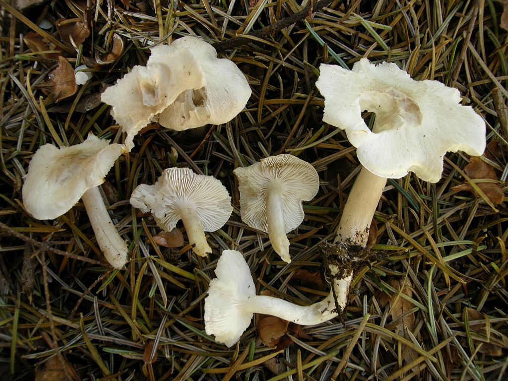 5) Dieser Fund erinnerte mich sofort an den Gemeinen Erdritterling, und freudig bemerkte ich das Vorhandensein von herrlichen alten und sehr mächtigen Kiefern in unmittelbarer Umgebung. Der Hut war auffallend dicht und fein grau geschuppt; die Lamellen sehr hell, fast weiß. Der Stiel ebenfalls nahezu weiß und nicht von schwärzlichen oder bräunlichen Fasern/Schüppchen überzogen. Der Geruch war nicht mehlig, weder beim intakten noch beim zerschnittenen Fruchkörper. Auch der Geschmack war nicht mehlig. Ich meine daher hier T. terreum vor mir zu haben.