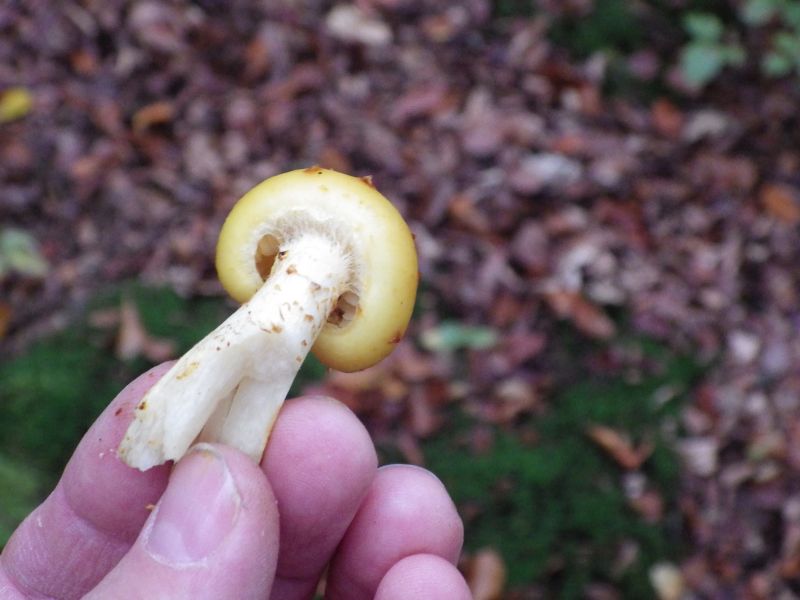 Der zweite war sehr fest verankert. Gelb, gepunktet. Roch auch sehr schwach. Kopf kugelig. Der Rest des Baumes war glaub ich eine Buche