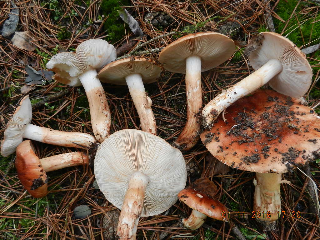 Nun zu den aktuellen Funden. Am gestrigen Dienstag waren fünf Arten der Weißbraunen Sektion klar unterscheidbar, dazu noch die durch einen wattigen Stielring sehr gut gekennzeichnete Art Tricholoma focale (Halsbandritterling).