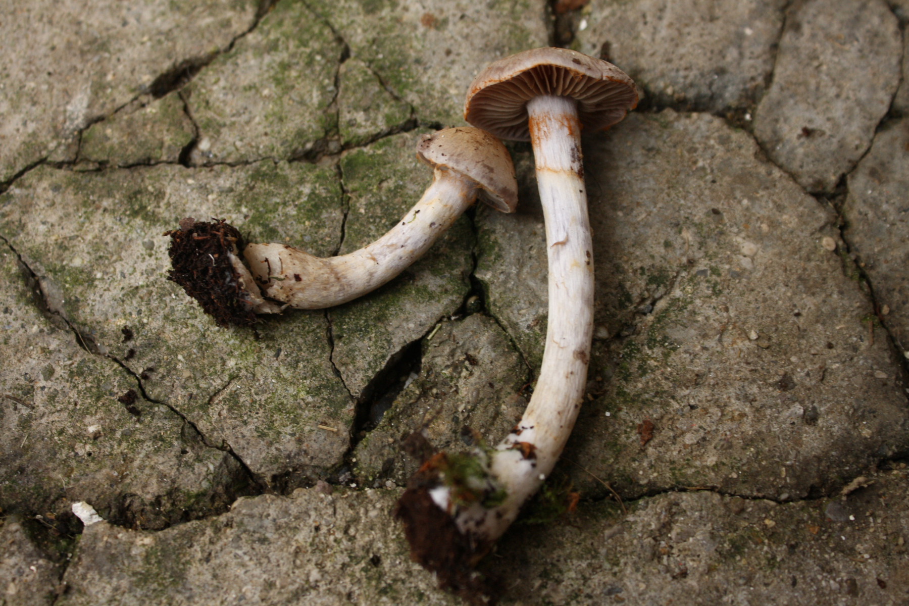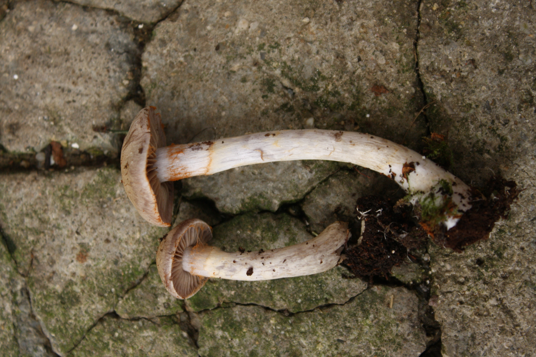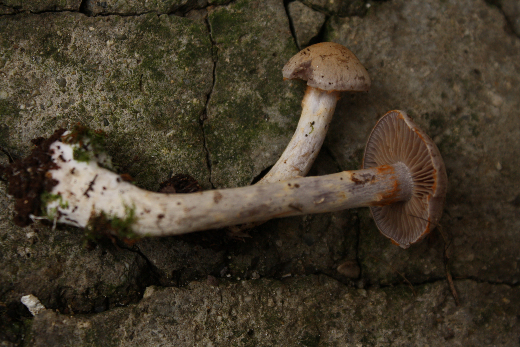 Der Hut ist so grau-lila, in der Mitte ockerlich, mit weißer Überfaserung. Insgesamt ist er relativ zierlich, aber langstielig - Hutdurchmesser ca 3 cm.