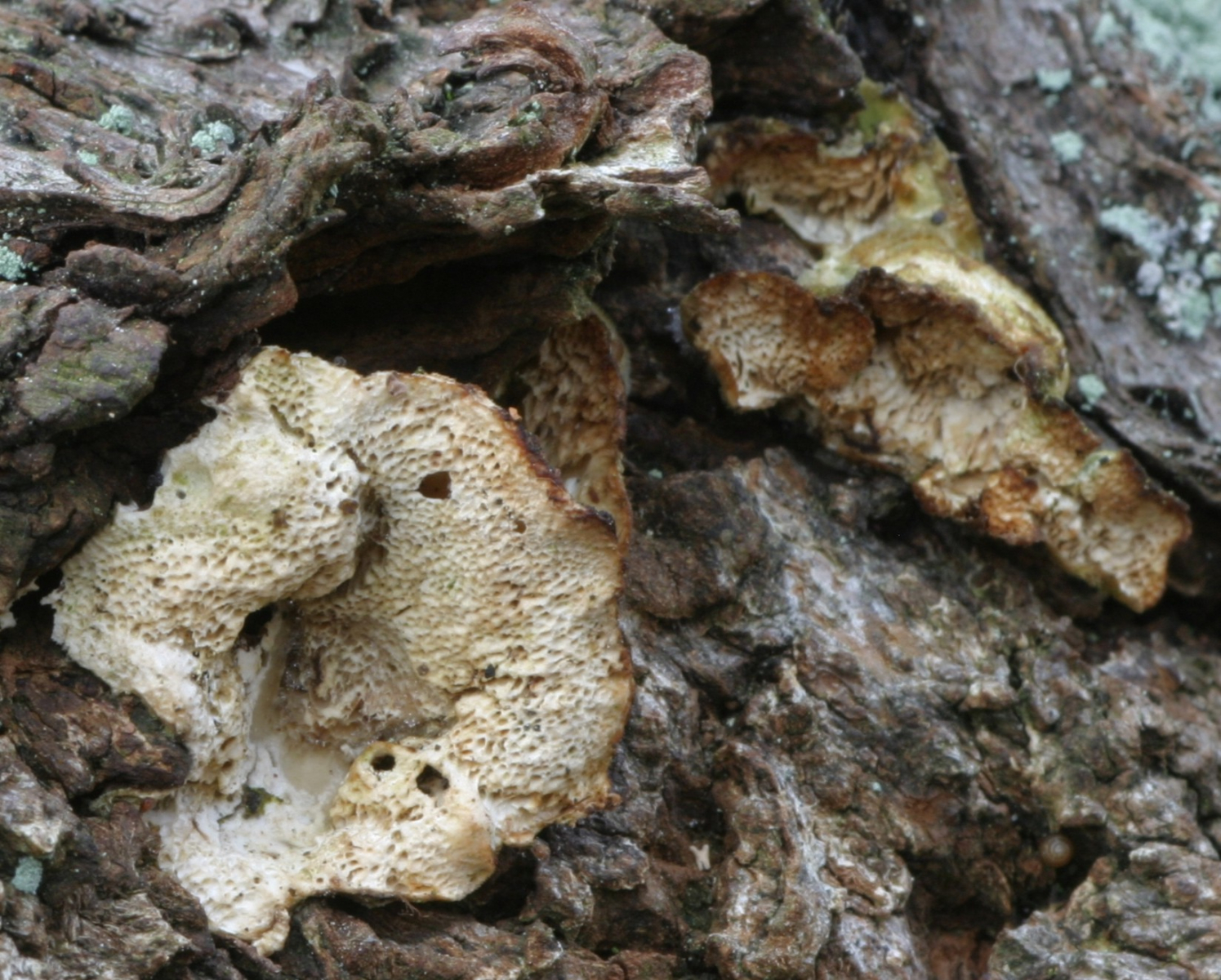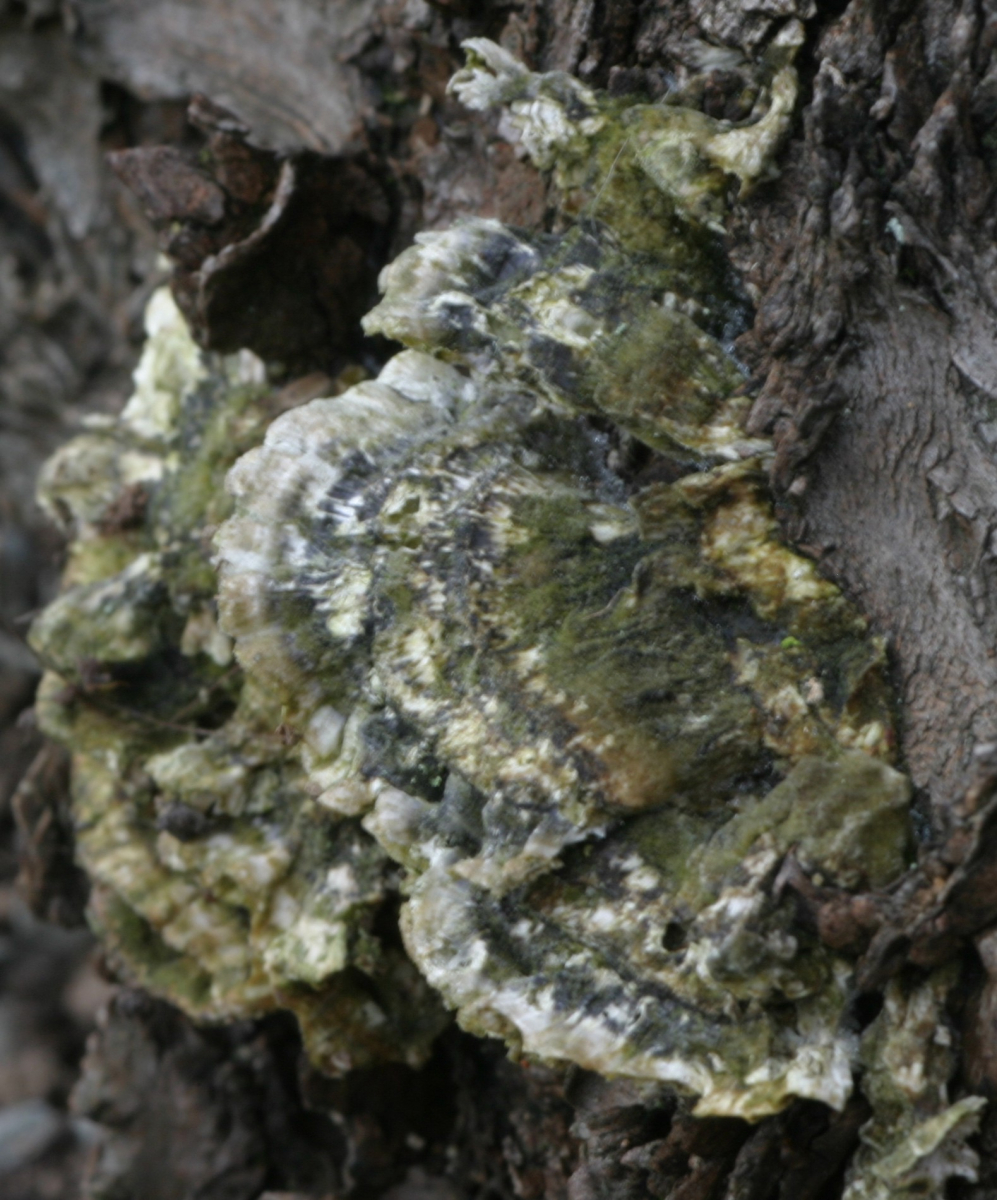 Tja, nach der Fleischfarbe müsste es dann Coriolopsis trogii (Blasse Borstentramete) sein. Ist aber dumm, einen Pilz zu bestimmen, den ich selber nicht kenne, denn irgendwie finde ich die Altersfärbung widersprüchlich zur Fleischfarbe.