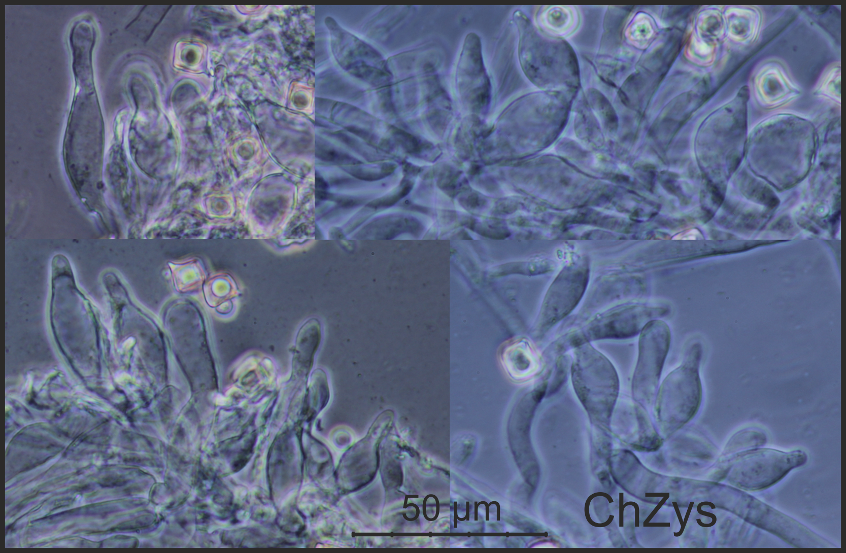 Geschlüsselt mit G und FE5. Aufgrund von Cheilozystiden von E. chloropodium abgegrenzt.