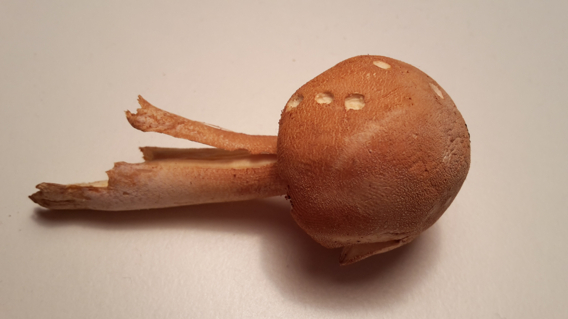 Beißspuren eines Kindergebisses kann ich nicht ausmachen. Kleinkinder nehmen Pilze in den Mund, kaum eines schluckt was runter. Da bist du jetzt gefordert, in der Erziehung. Was darf ins Mäulchen, was nicht ...