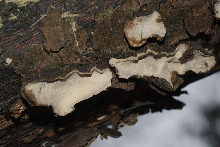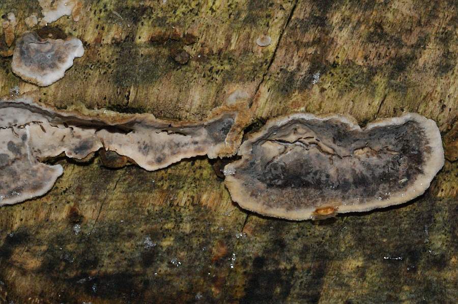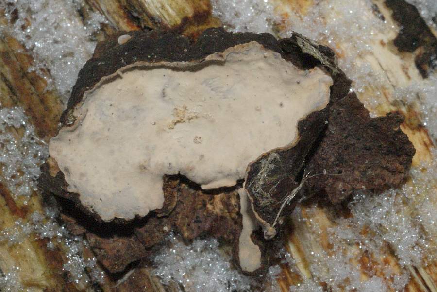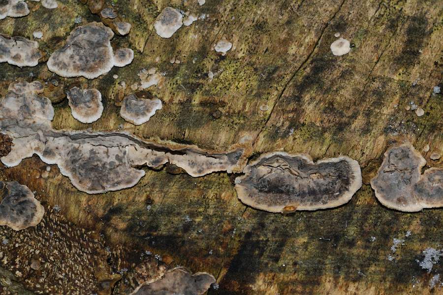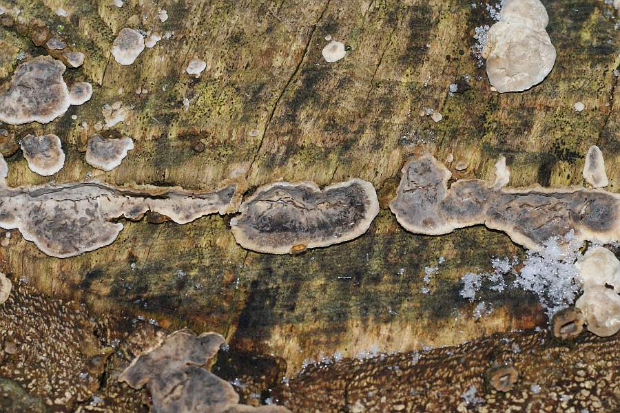 Sie wuchsen stärker resupinat, die Kanten fast überall etwas vom Substrat abgehoben. Farbe grau bis bräunlich, in der Mitte hin lebhafter, zum Rand hin heller gefärbt. Rundum am Rand mit hellem, teilweise fast weißen Streifen. Bei größeren, älteren Exemplaren ist der Randbereich nicht mehr weißlich sondern der restlichen Farbe stärker angegelichen. Keine Verfärbung auf Druck oder Ankratzen (aber es hat gefroren, könnte bei Plusgraden evtl. anders ausfallen). Kein Geruch. Größe der Fruchtkörper bis ca. 3 cm lang. In der Mitte oft rissig.