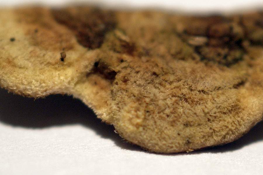 Konsistenz fest/hart, knapp einen mm dick. Man könnte sie durchbrechen. Oberfläche geringfügig kleiig gepockt, keine Verfärbung auf Ankratzen, kein Geruch. Die Fruchtkörper wuchsen auf einer recht kleinen Fläche mit nur wenigen Exemplaren.