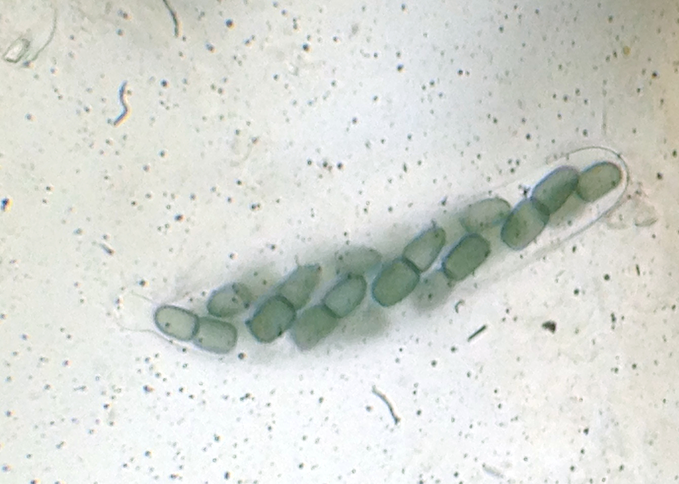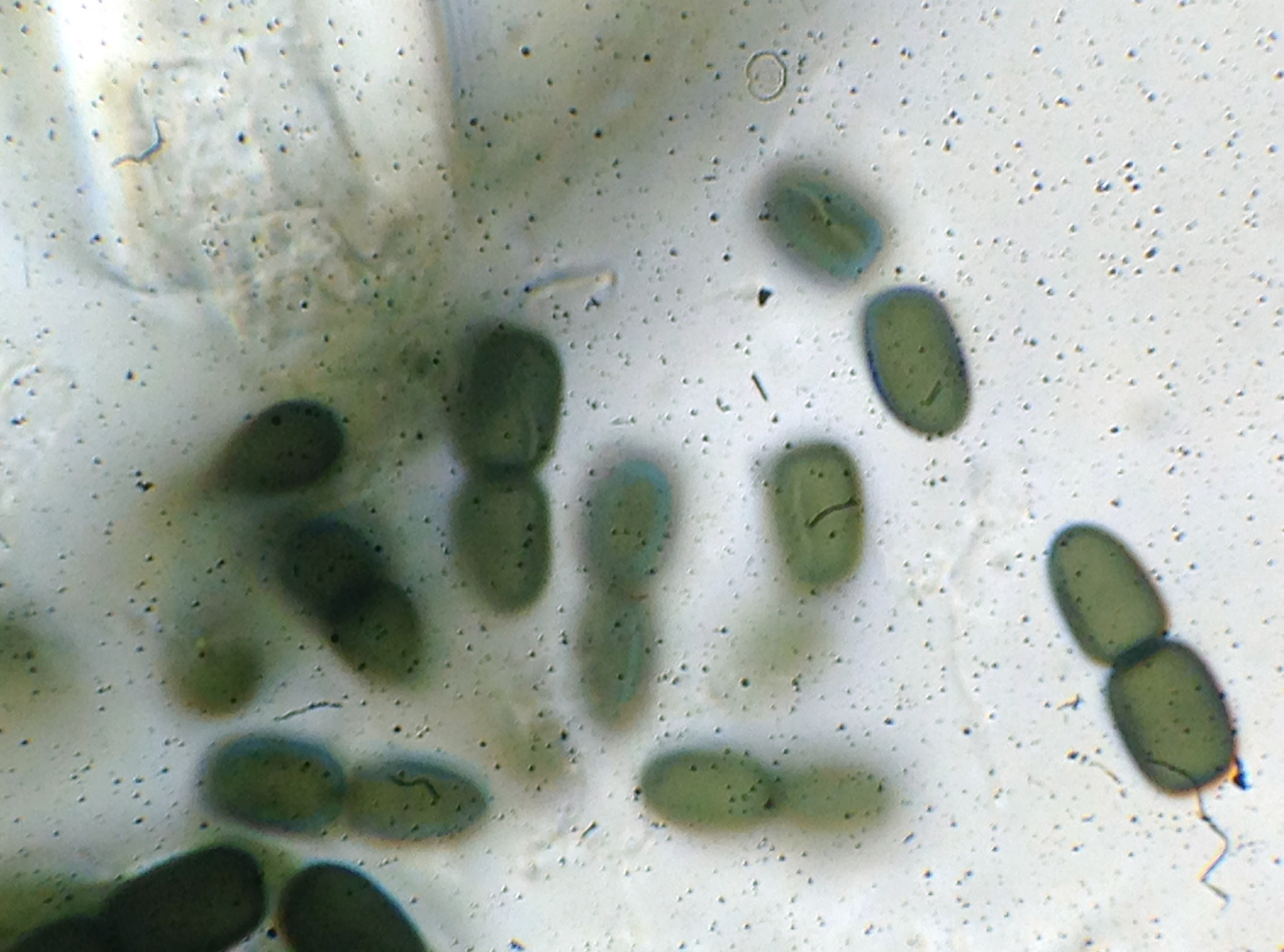 Ascosporen 4-zellig, allerdings sehr schwer zu sehen, da die Sporenketten schnell zerfallen. Auffällig ist zudem, dass die Sporen nicht uniseriat im Ascus liegen und die Keimspalte einen Knick aufweist (Hoffentlich einigermaßen zu erkennen). 29 - 34 x 4,8 - 6 µM