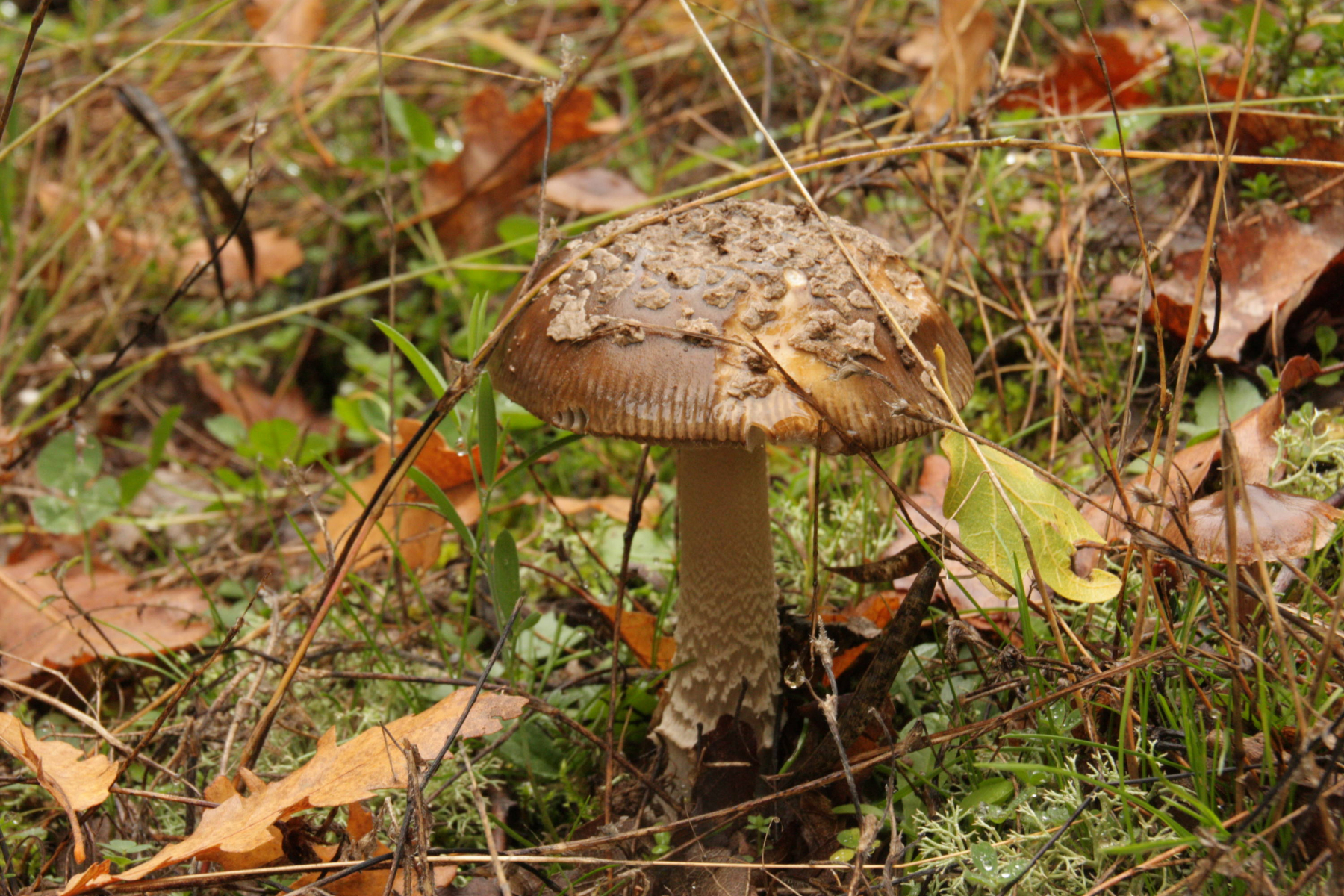 14. Riesenscheidenstreifling (Amanita celiae). Ein auffälliger, großer Pilz, mit gräulichen Lamellen und deutlichen zwei häutigen Zonen im unteren Stielbereich.