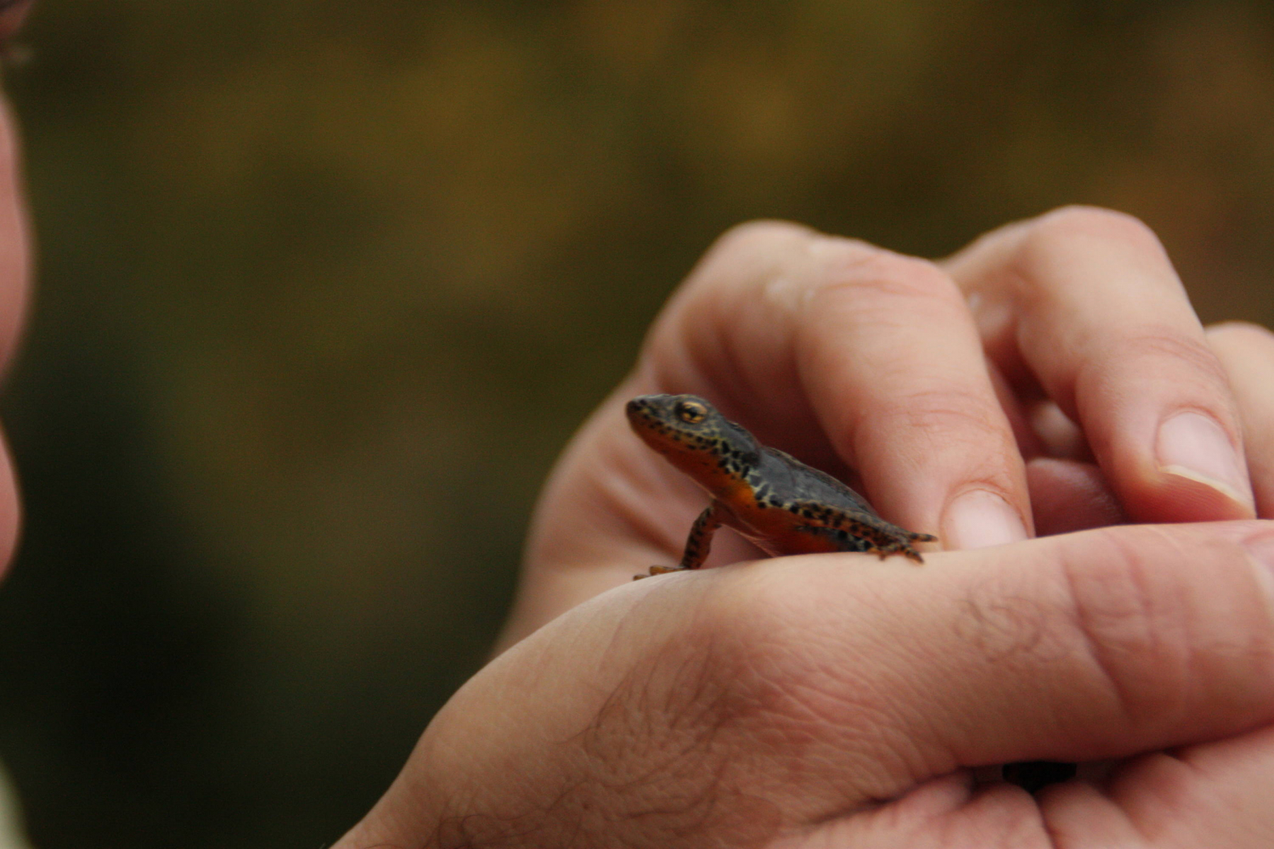 16. Ein kleiner Bergmolch (Ichthyosaura alpestris). Da war dann der Freund wieder hellauf begeistert, der bei meiner Pilzbegeisterung meist ein eher nachsichtiges Lächeln an den Tag legt und tapfer alles bewundert...