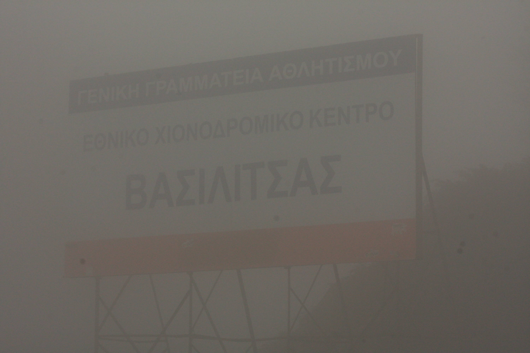 17. Neben dem Zielwald: Skizentrum Vasilitsa. Im dichten Nebel war das riesige Schild kaum zu erkennen. Gruselige Atmosphäre!