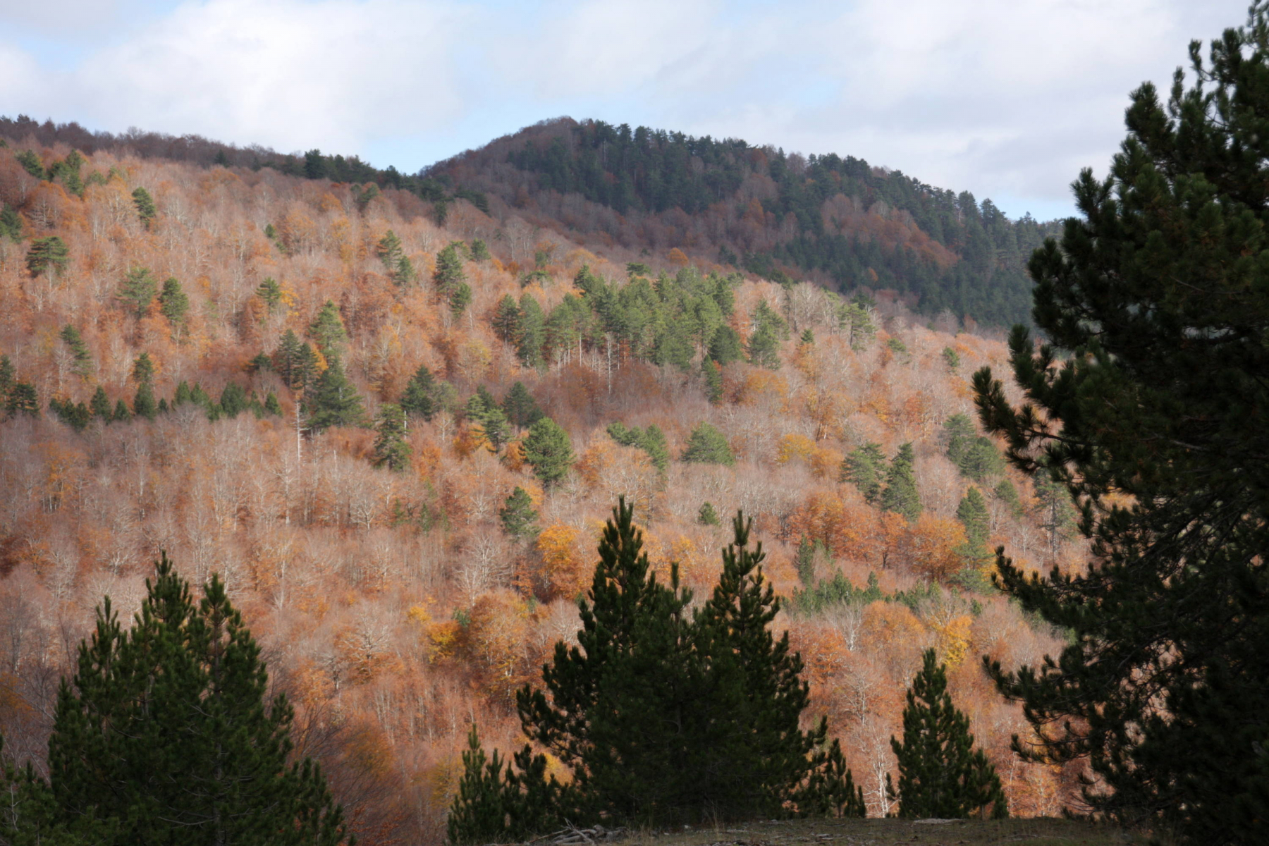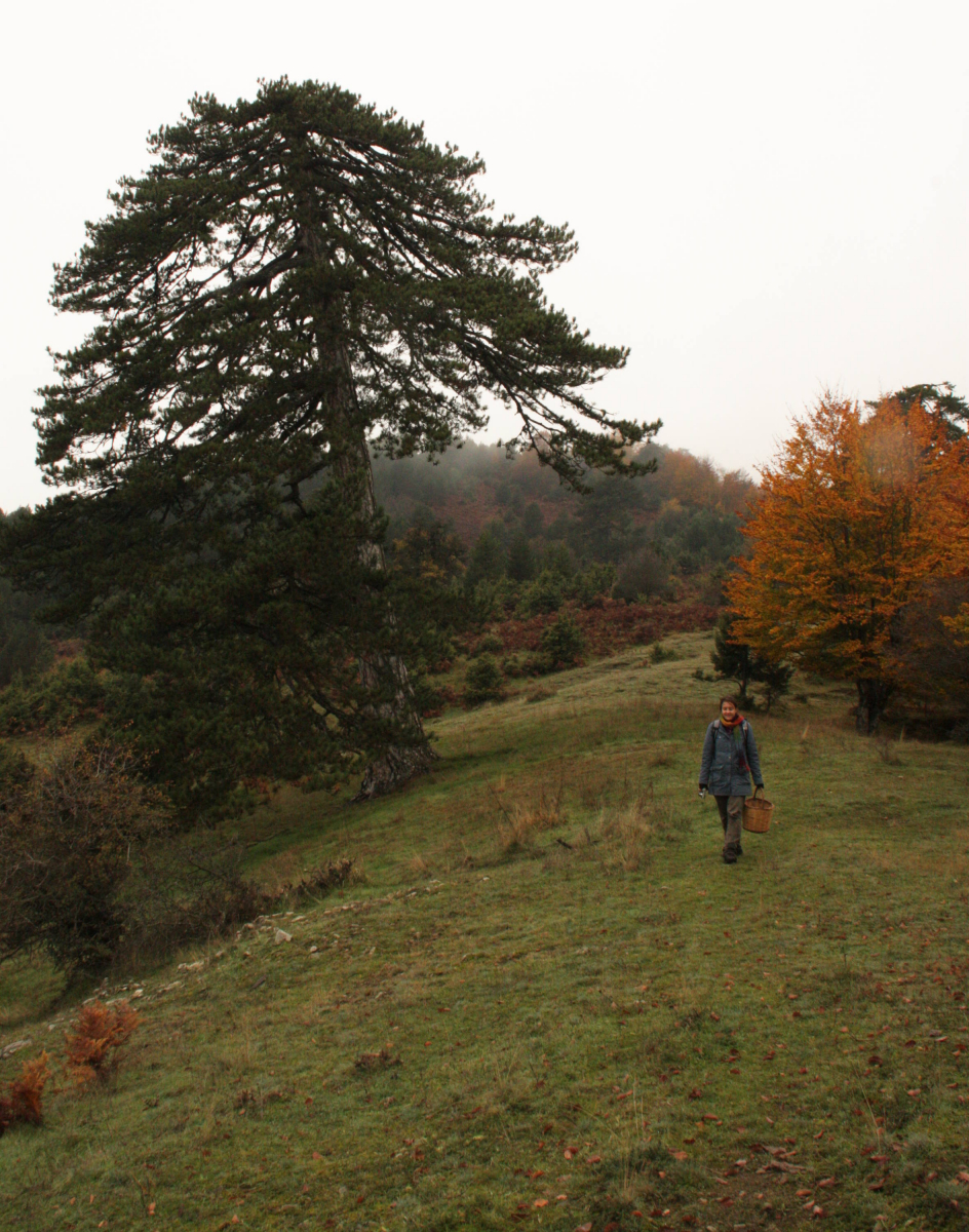 40. Dann noch eine kleine Tour zu den Kiefern. Die Gegend hier beheimatet eine seltene Kiefernart, die Schlangenhaut-Kiefer (Pinus heldreichii). Diese Art kommt sehr zerstreut auf dem Balkan vor, und selbst im Pindos-Gebirge nur an einer einzigen Stelle. Die Bäume sind extrem kräftig und ausladend, und haben lange, dunkle Nadeln. Die Rinde formt wunderschöne Muster - der Name kommt also nicht von ungefähr!