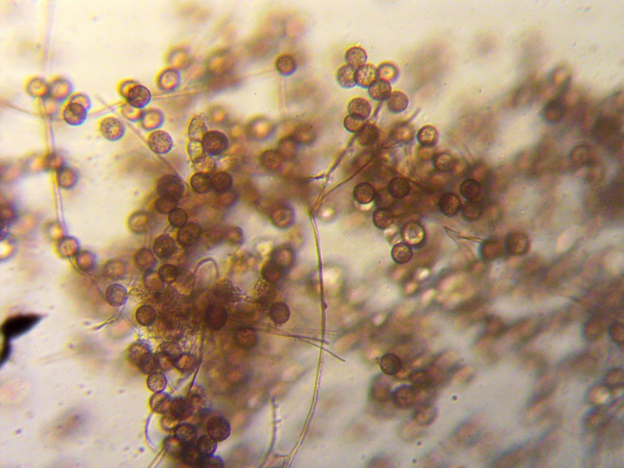 Die Sporen sind im Durchschnitt 8,5 - 10 µm im Durchmesser und grobwarzig bis stachelig. Die kleineren Punkte würde ich als Kalkgranulation interpretieren.