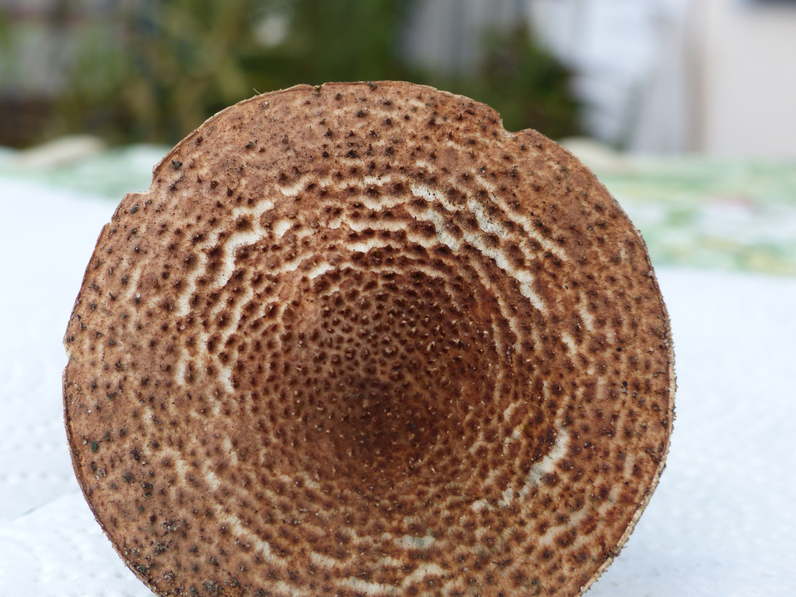 Hut: cremefarben mit "Stacheln" in braun, Durchmesser etwa 6-7 cm, Dicke etwa 0,2-1 cm, mittig einen leichten Buckel, Hutrand ein klein