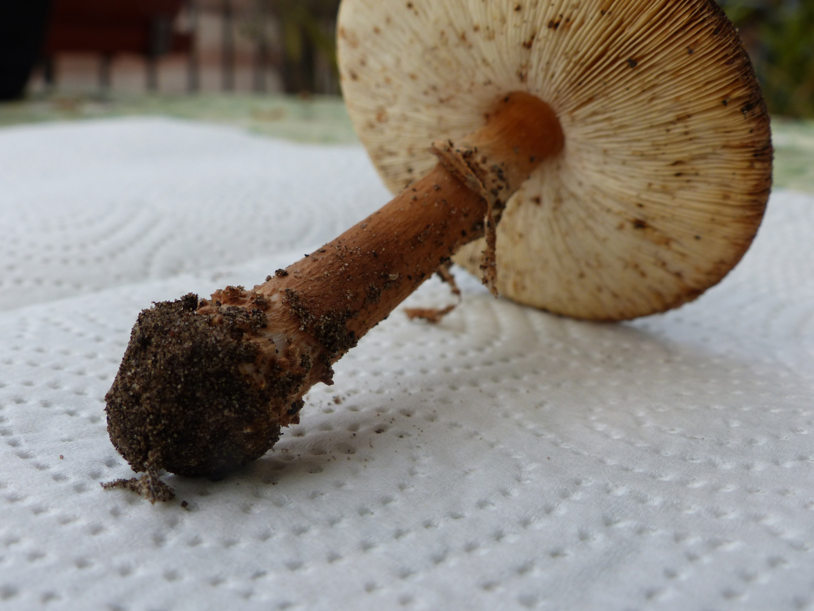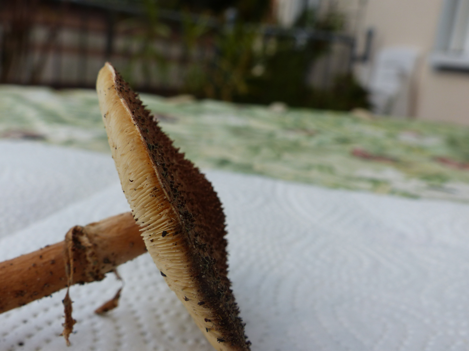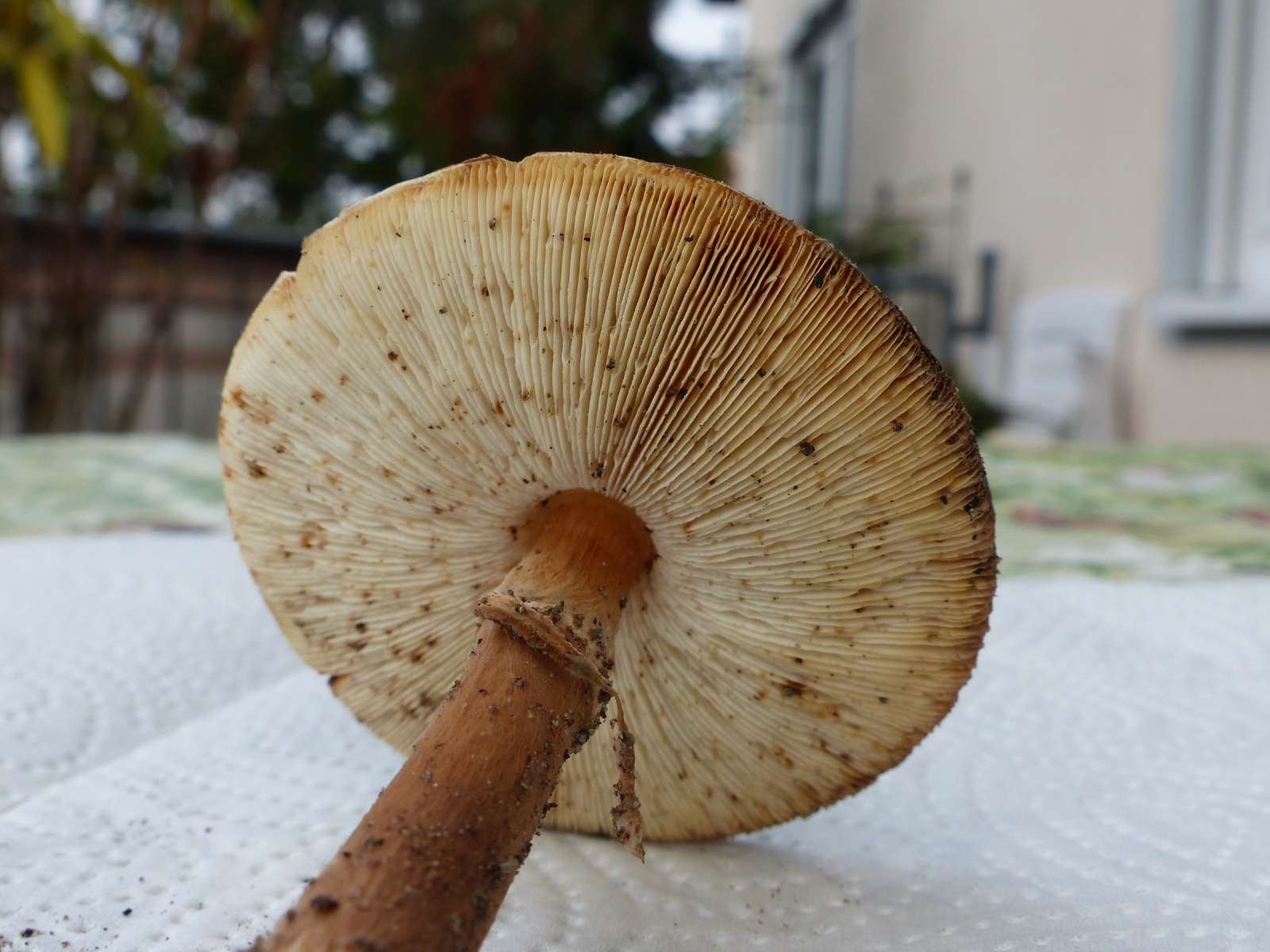 Lamellen: vom Boden her mit Sand "bespritzt"? Oder sind sie wegen des Alters gesprenkelt? dicht stehend, untermischt, nicht gekerbt an den