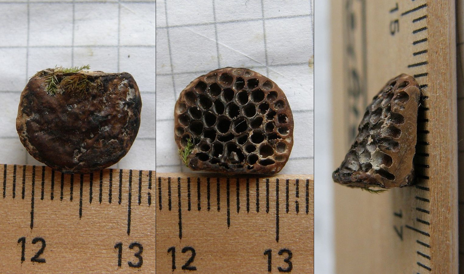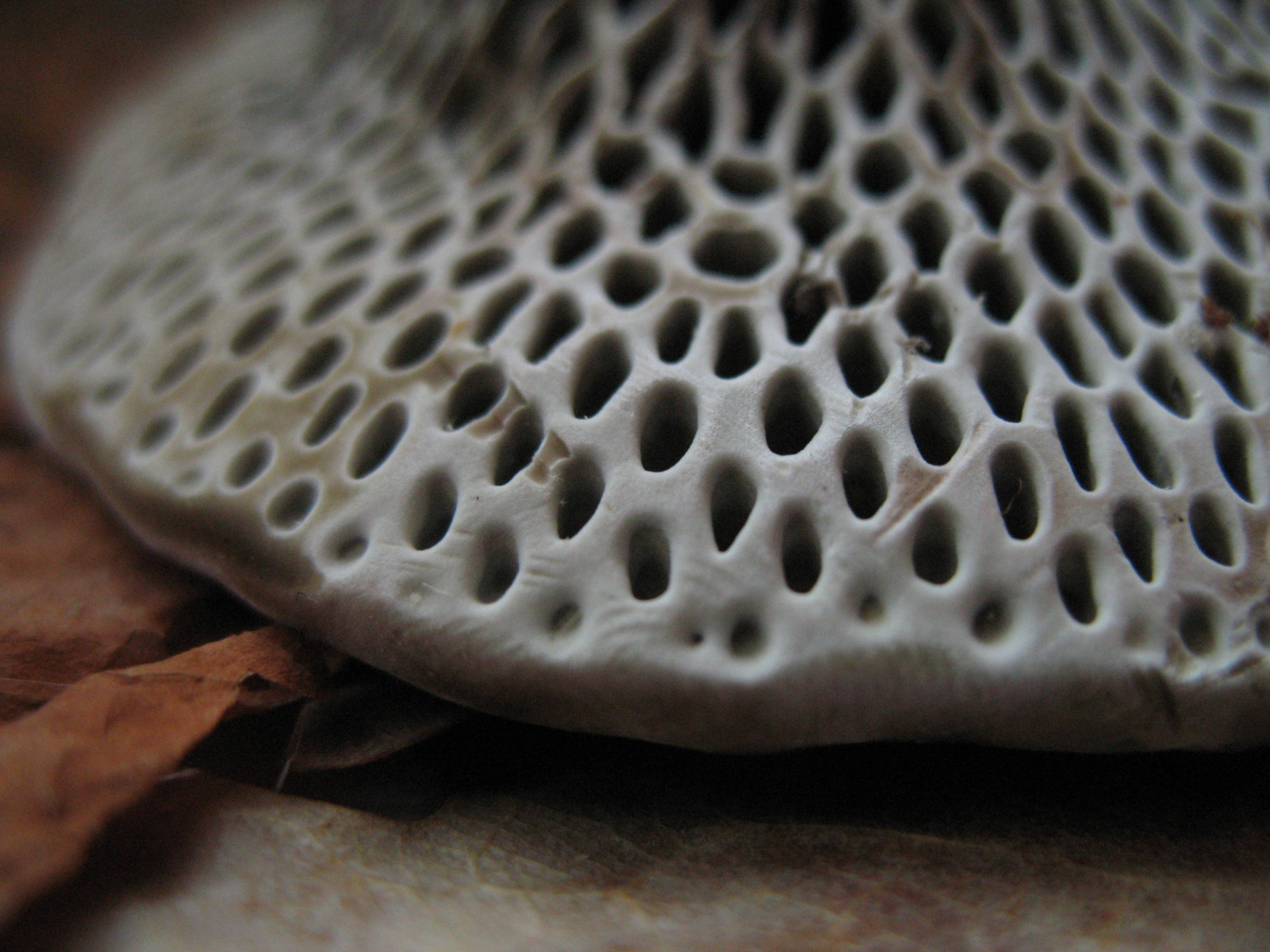 Fruchtkörper: Hut 5-10, selten bis 20 cm Breite, ca 1-5 cm Dicke, halbrund, ohne Stiel am Holz angewachsen. Unregelmäßige (buckelig, grubig) aber glatte (nicht filzige) Oberfläche, braun-grau gezont, am Rand weiß. Poren sehr weit (1-3mm), weiß, rhombisch, fünf-bis sechseckig, ein regelmäßiges Wabenmuster formend. Auf Druck und im Alter bräundend Fleisch/Trama gelbbraun, mit KOH schwärzend