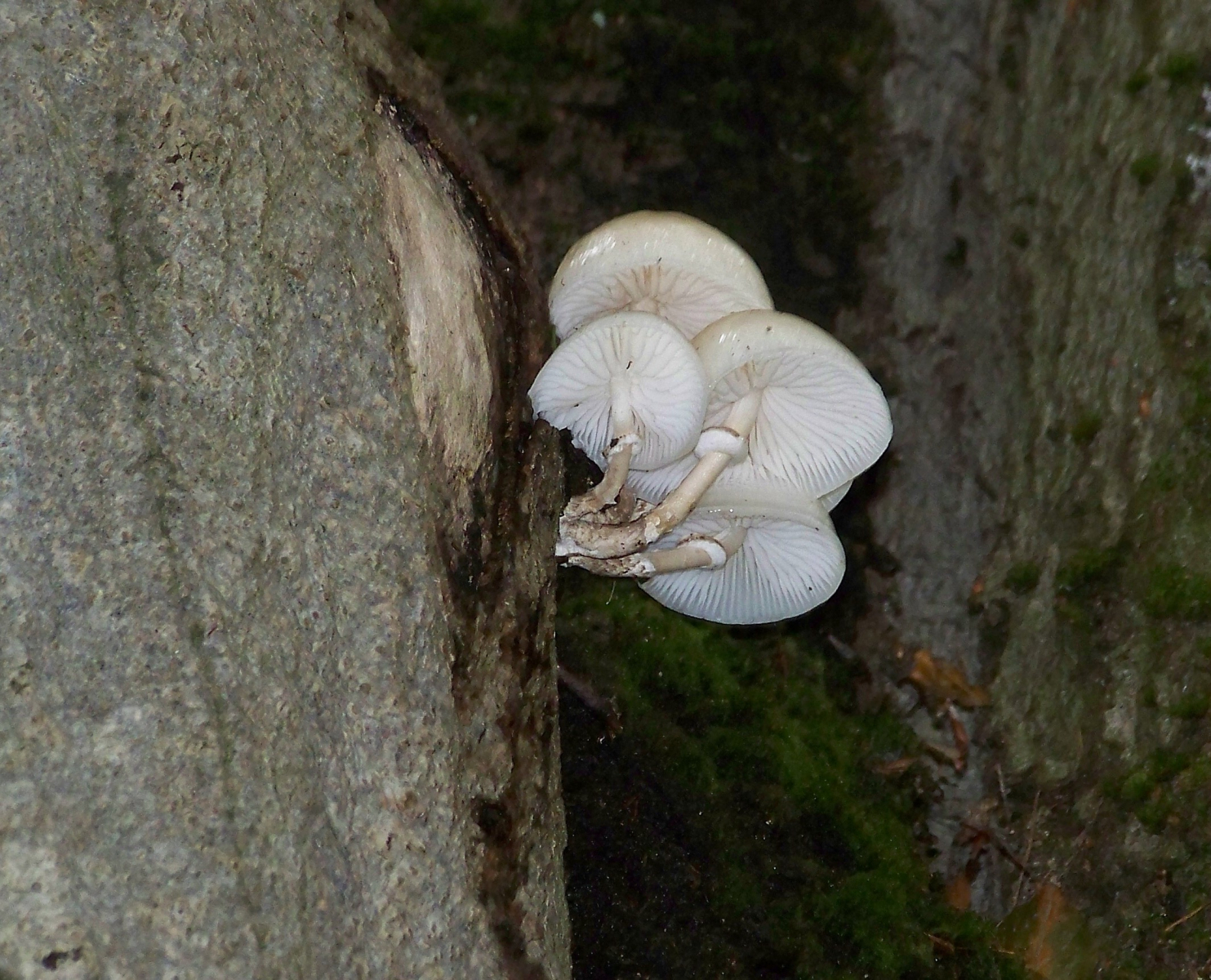 Dafür sieht man sie recht gut von unten... ==16 (Ihre Lamellen teilen sich in Richtung Hutrand, sie haben deutliche Ringe, am Fuß etwas rauh und bräunlich geschuppt, weiter oben ist der Stiel glatt. Vom Hut sieht man nur, daß er auch weißlich ist und glänzt. Da sie so weit oben sind, kann man die Größe nur schätzen: Hut ca. 4-6cm Durchmesser.)