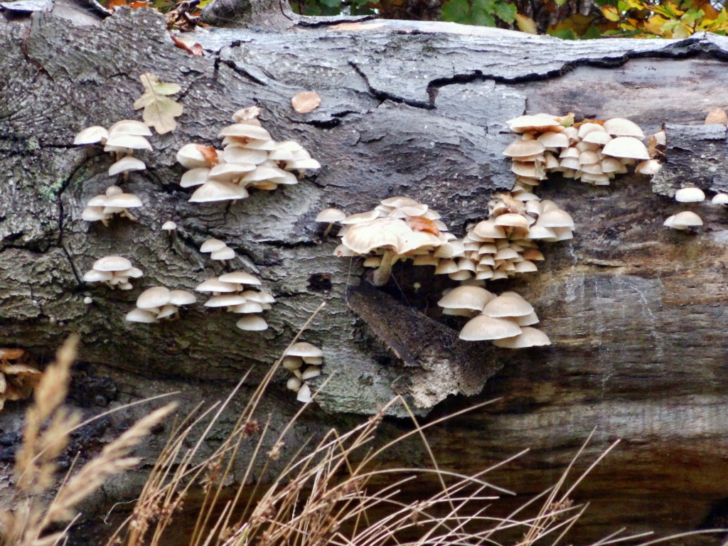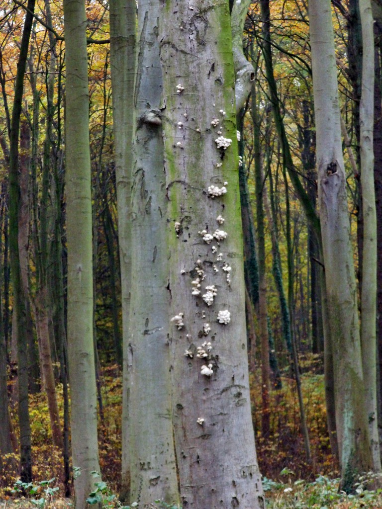 hier wieder einmal einige kleine weißliche Unbekannte, die mir und meinem Mann im Mini-Kurzurlaub in der Rhön (21.-23.10.2016) begegnet sind! Sie waren so weit oben auf ihrem etwas müde dreinschauenden Baum (Buche im Buchenwald), daß wir sie nur mit dem eher bescheidenen Zoom unserer Digicam aufnehmen konnten.