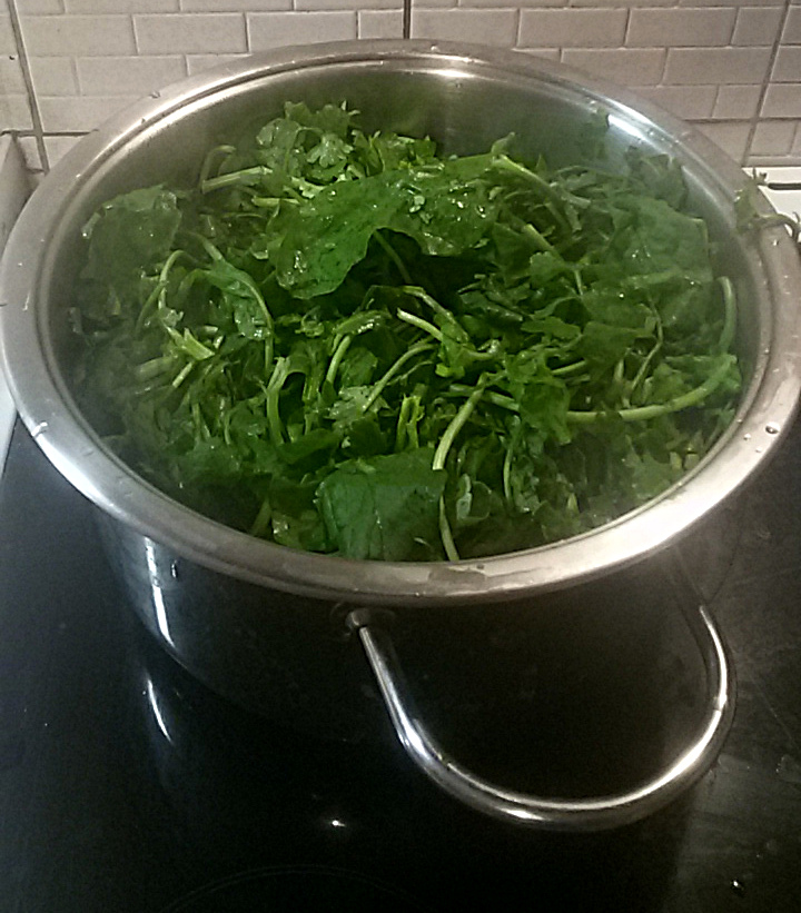 Deckel drauf, und ein paar Minuten einkochen lassen. Wenn das Gemüse ein bisschen an Volumen verloren hat, alles verrühren, ca. einen Liter Wasser dazugeben, Deckel drauf, und ungefähr eine halbe Stunde köcheln lassen. Das kommt ein bisschen auf das Gemüse an, Salate und Spinat brauchen weniger Zeit, Löwenzahn, Rote Beete, Mangold eher ein bisschen mehr. Zwischendurch kontrollieren, dass genügend Wasser im Topf ist, es soll ja nichts anbrennen.