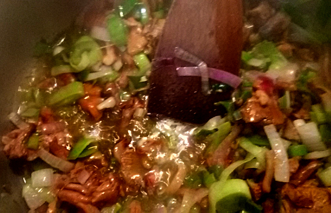 Öl in eurem größten Topf erhitzen. (Das Gemüse nimmt anfangs viel Platz weg, man braucht also einen großen Topf). Zwiebeln, Lauch, Frühlingszwiebeln dazu und anbraten. Nach ca. 5 Minuten die Pilze dazu (entweder gefroren direkt in den Topf, oder frische Pilze in mundgerechte Happen geschnitten).