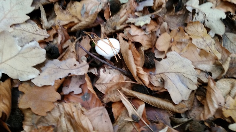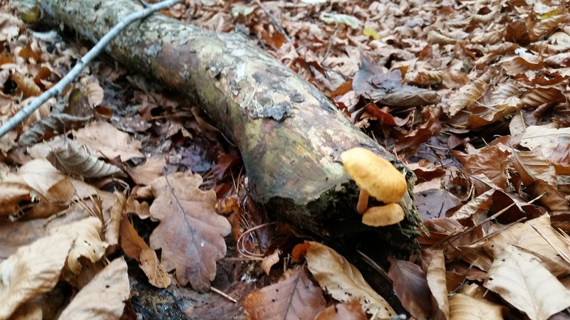 1. 4 Fotos die an der selben Stelle gemacht wurden. Die Pilze wachsen auf alten heruntergefallenen Kiefernästen. Größe ungefähr an den Eichen- und Buchenblättern bestimmbar.