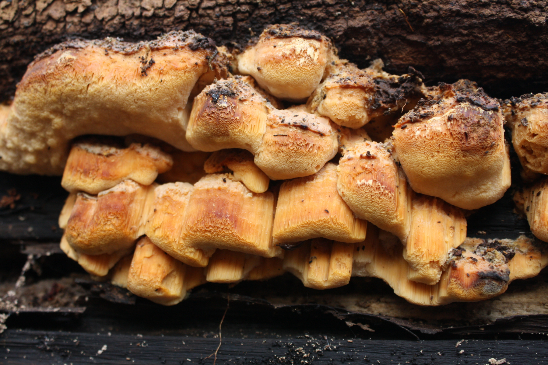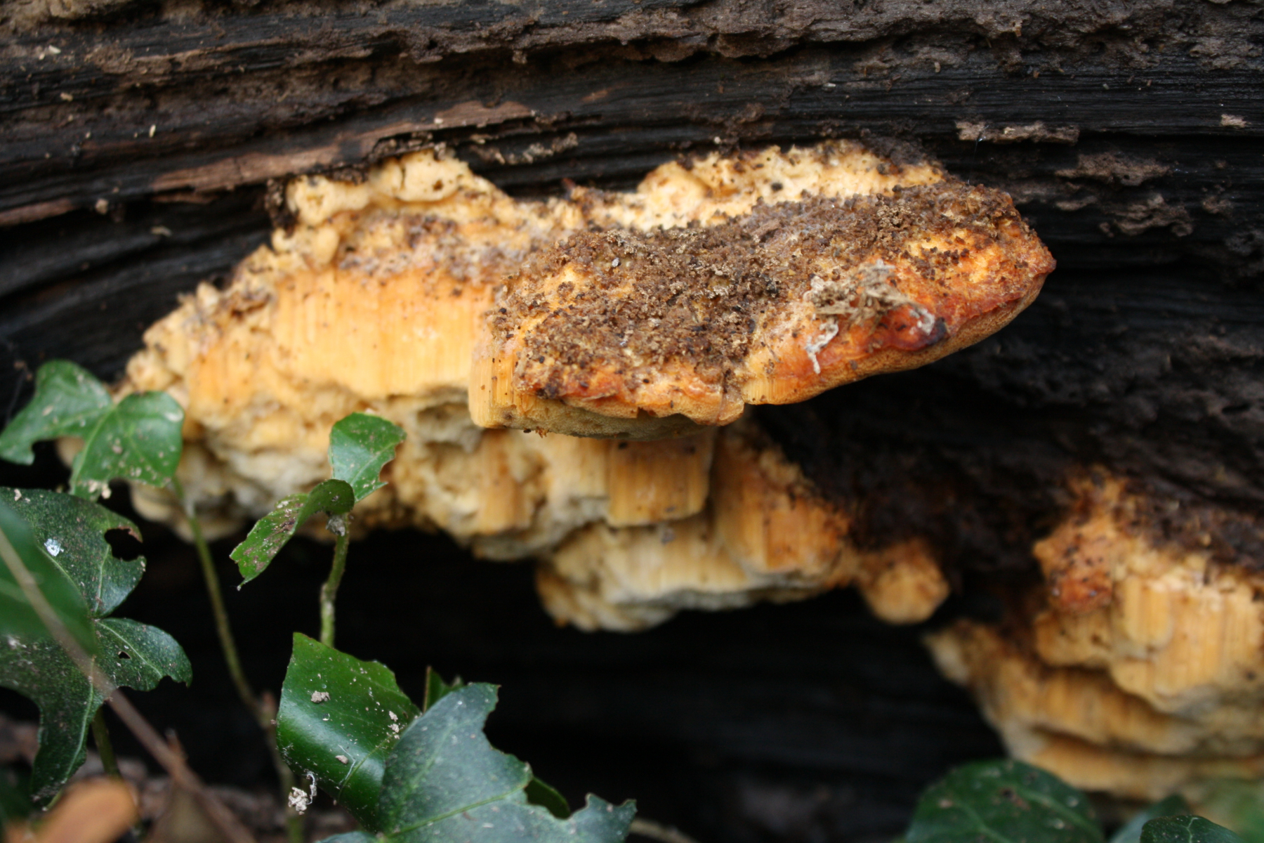 Ich denke, daß es sich da um Auriporia aurulenta handeln könnte. Die Art kann sowohl Nadelholz als auch Laubholz besiedeln. Allerdings gibt es noch weitere Alternativen bei Hapalopilus / Rigidoporus sowie Ceriporia und Ceriporiopsis.