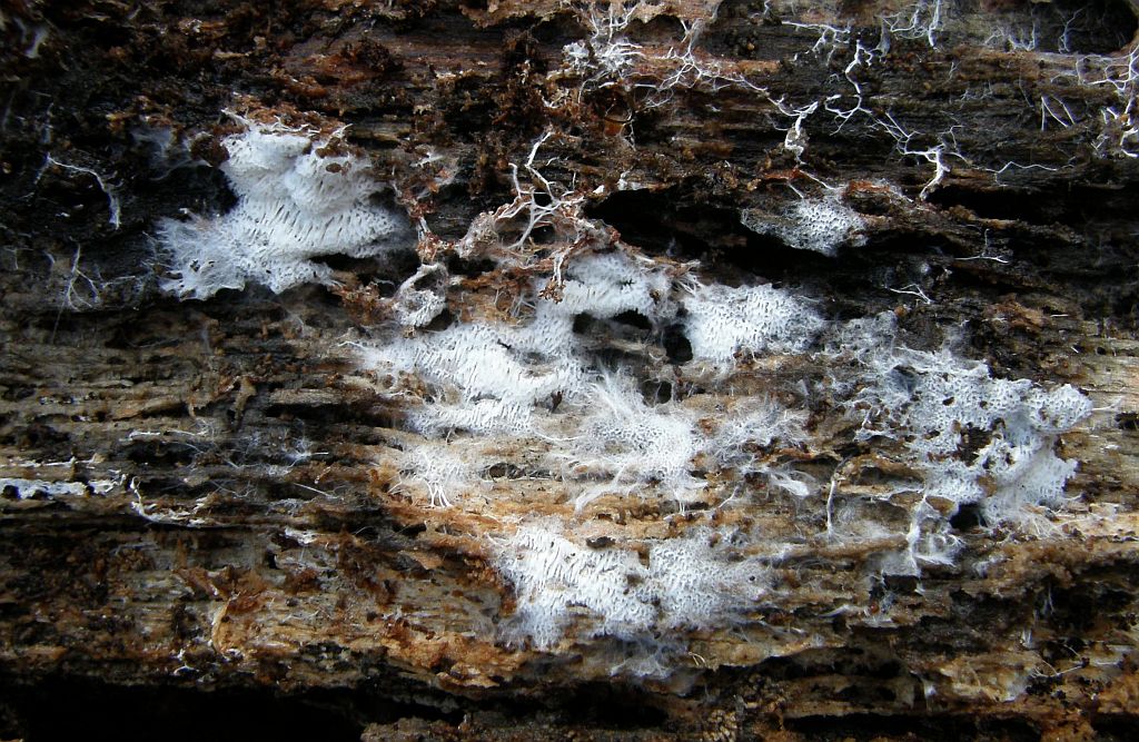 Wo ich mich vertan hatte: Diese lustigen, meruloiden Beläge an allerlei Laubholz sind natürlich nicht Phlebia rufa, sondern Ceraceomyces serpens (Gewundene Wachskruste):