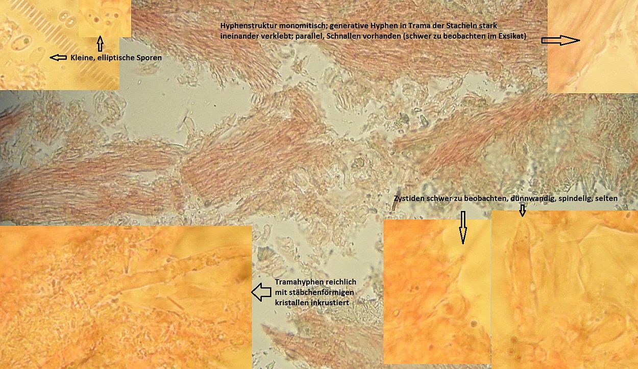 Problem: Keine aufgeblähten, rundlichen bis sackartigen zellen. Nicht im Subikulum, nicht in den Randbereichen, nicht in den Rhizomoprhen im Substrat. Allerdings einige total kollabierte Elemente, die vielleicht mal soclhe Zellen gewesen sein könnten. Ist aber im Grunde wohl irrelevant: Mit poroidem Hymenium, dicht stacheligen Sporen bis ca. 5,5 µm, ohne Skeletthyphen und ohne Zystiden kommt man im Dämmrich - Schlüssel zu dem Punkt, wo man die Kristalle im Subikulum beurteilen muss. Und da sind keine Nadelförmigen Kristalle, keine bipyramidalen Kristalle, nur neben den amorphen, rosettenförmigen viele couvertförmige bis rhomboide Kristalle.