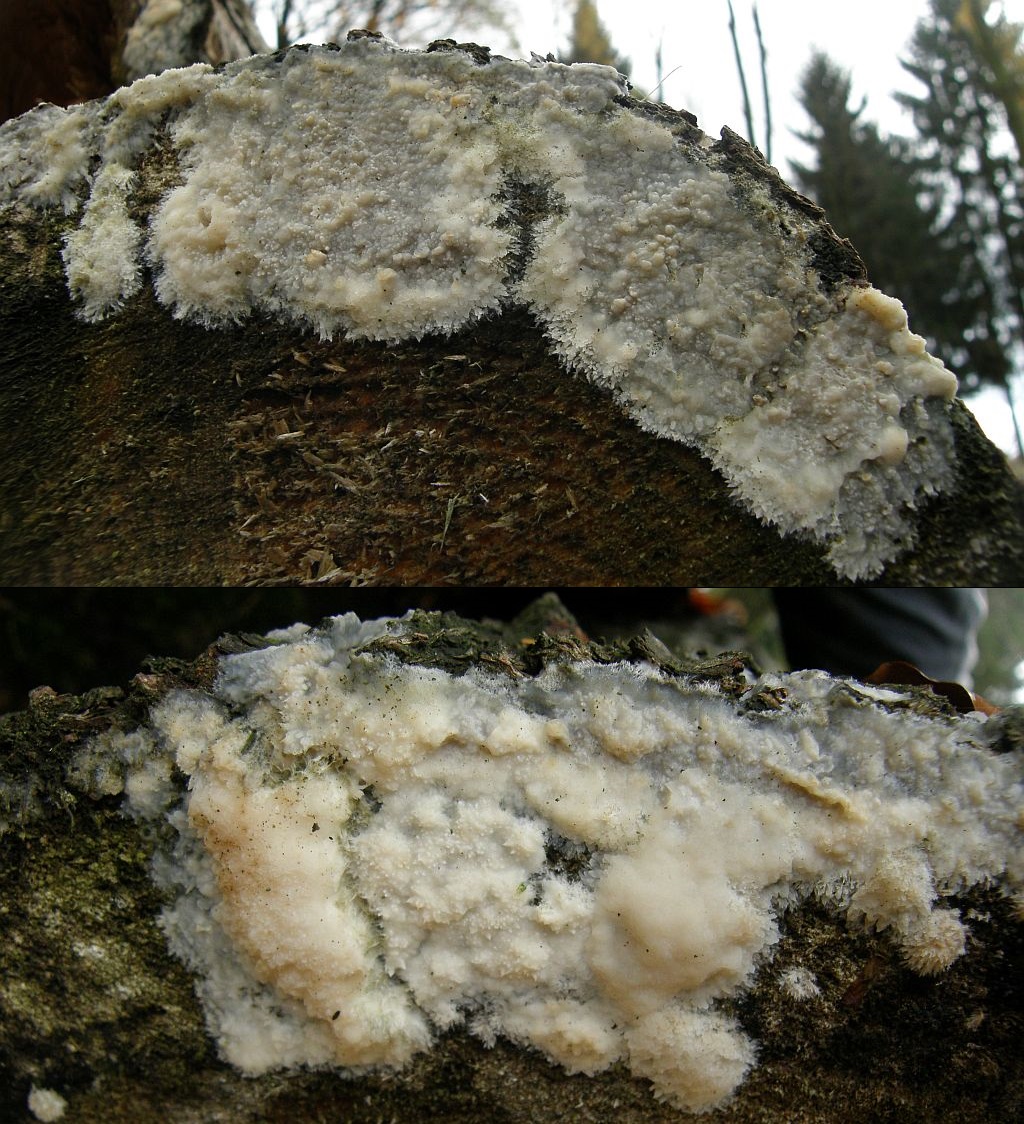 Dieser dünne, etwas wachsartige Belag hört auf den Namen Globulicium hiemale (Winter-Kugelsporwachskruste wäre der logischste deutsche Name):