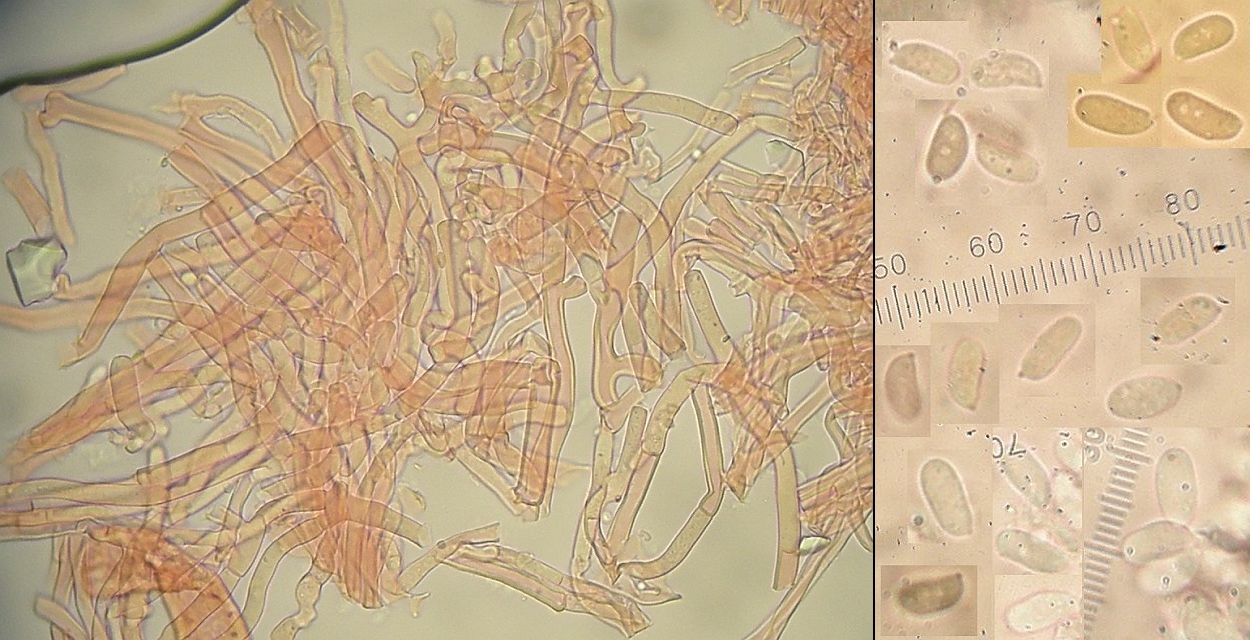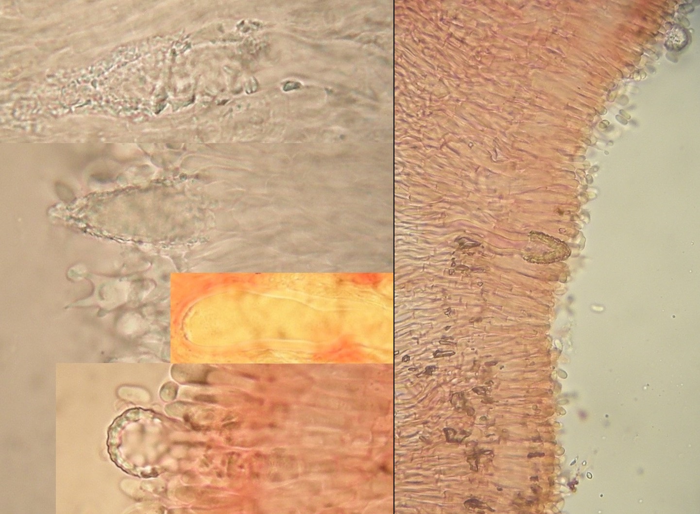 Faulbaum ist als Substrat allerdings recht ungewöhnlich. Hyphodontia pallidula bewohnt normalerweise Nadelholz. Kann aber durchaus auch mal fremd gehen. Die Bestimmung ist allerdings kritisch, da der Pilz schon ziemlich verwittert ist. So sind kaum zuordenbare Sporen zu finden, die aber (klein und breit elliptisch) passen schon zu der Art. Ebenso das fehlen von richtigen Lagenozystiden, dafür gibt es reichlich hyphoide, zystidenartige Elemente, die meist aus dem Subhymenium kommen, mehrfach septiert sind, vor allem in den unteren Gliedern etwas dickwandig und apikal ziemlich vielgestaltig (kopfig - zylindrisch - obtus). Basidien eingeschnürt, viersporig; überall ganz viele Schnallen.