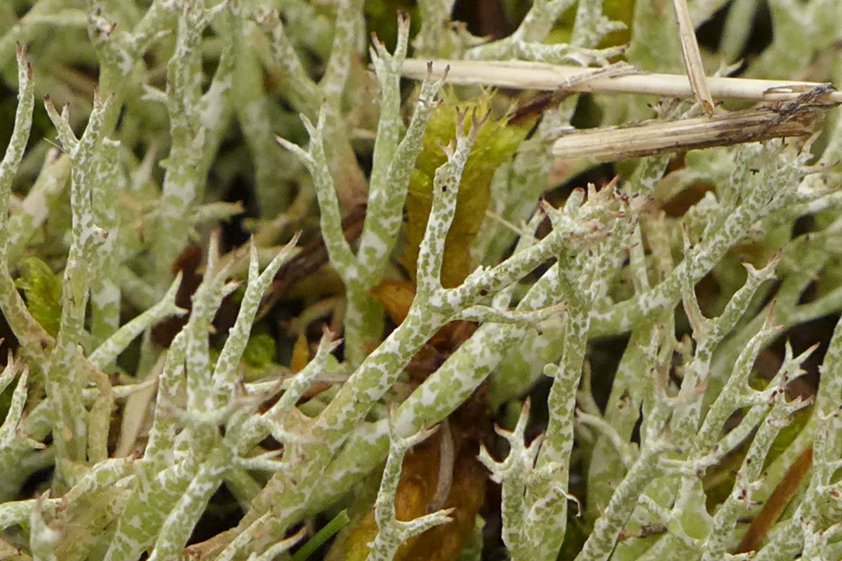 Auffällig eine bodendeckerartige Flechte, weil Trockenrasen auf Kalk und wg. des Aussehens müsste es sich um die Falsche Rentierflechte, Cladonia rangiformis handeln.