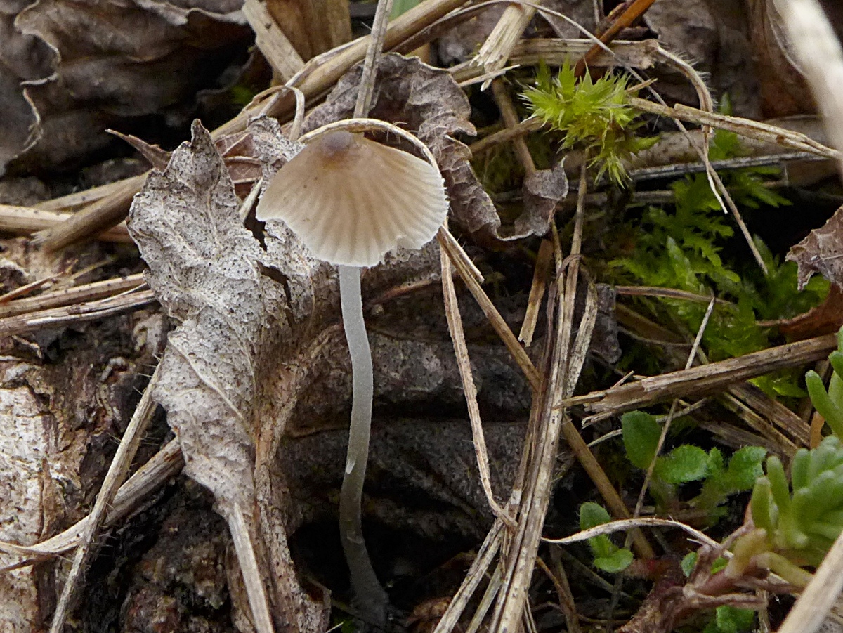 Ein Einzelexemplar von einem sehr zarten kleinen Helmling (Mycena spec.) oder eher (?) Reifhelmling (Mycenella spec.) möchte ich noch zeigen, nicht weiter angeschaut oder daran gerochen, aber der Stiel war bereift von oben bis unten, der Hut ca. ein Zentimeter breit.