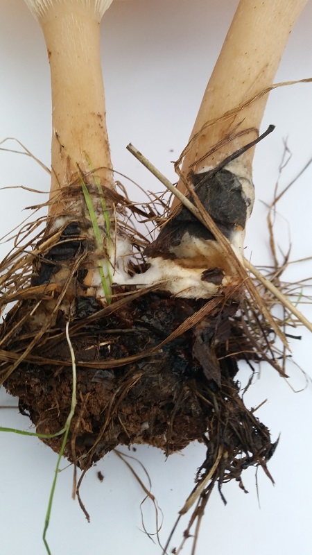 Ort: Nähe Waldrand unter Apfelbaum. Geruch intensiv, leicht süßlich. Durchmesser der Hüte ca. 12-13 cm. Stiel längsfaserig, ca. 18 cm.