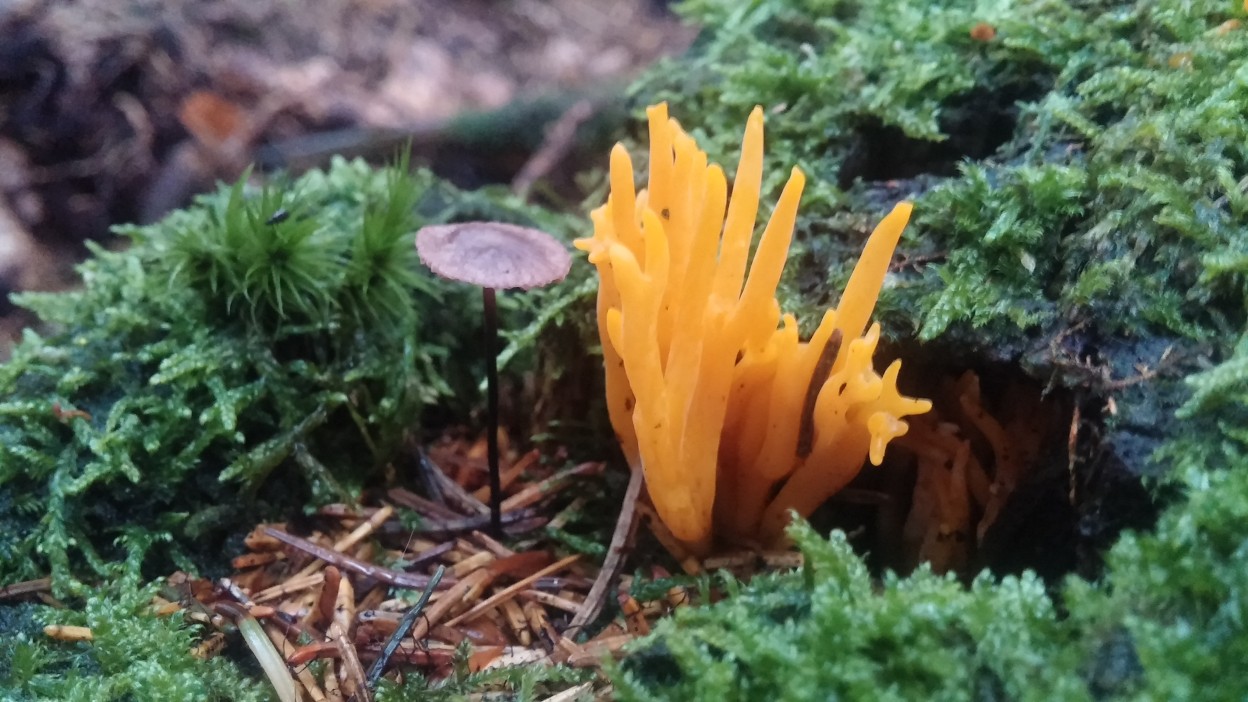 Der linke Pilz auf Bild 4 dürfte ein Roßhaar-Blaßsporrübling (Gymnopus androsaceus) sein, früher Roßhaarschwindling. Der wächst hier seit Anfang September teilweise massig im moosigen Fichtenwaldboden.