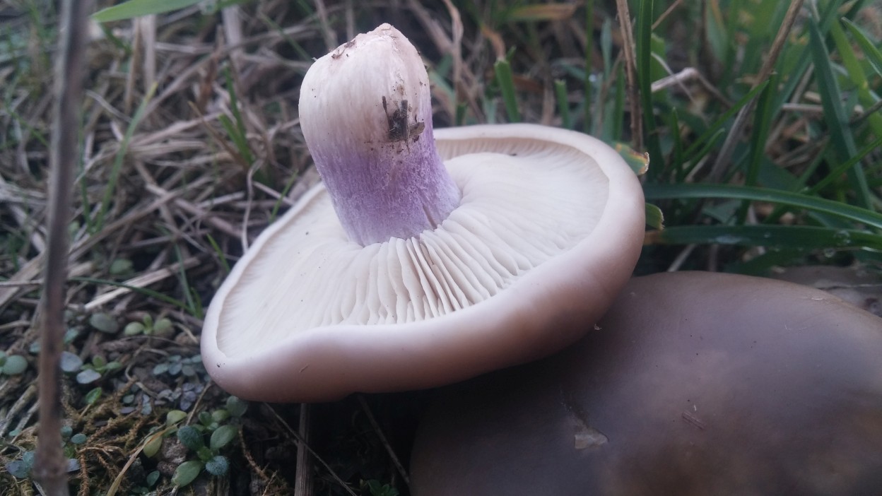 Saftlinge habe ich da leider keine gefunden. Aber jede Menge von diesen hier. Erst dache ich an Nebelkappen, aber dann ist mir der lila Stiel aufgefallen. Hab ein bisschen meine Pilzapps befragt. Nuda nicht, aber ich glaube es könnte der [font="Arial, sans-serif"]Lilastieliger Rötelritterling [/font]LEPISTA PERSONATA sein. Das wäre Erstfund. Meine Tochter hat ohne Beeinflussung auch den Lila Stiel gesehen.