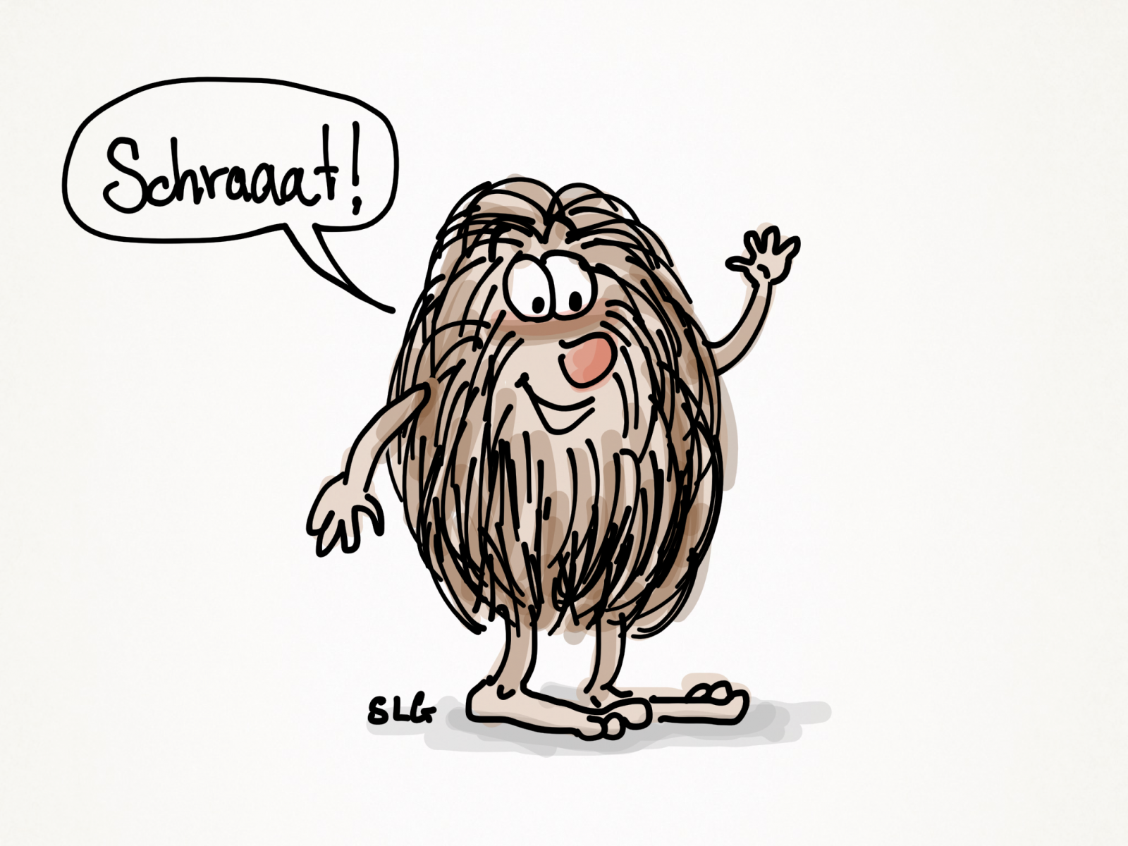 Der ist die ganze Zeit beschäftigt mit seiner neuen Erfindung, einer "Popel-pflück-verdreh-und-katapulTIER-Maschine".