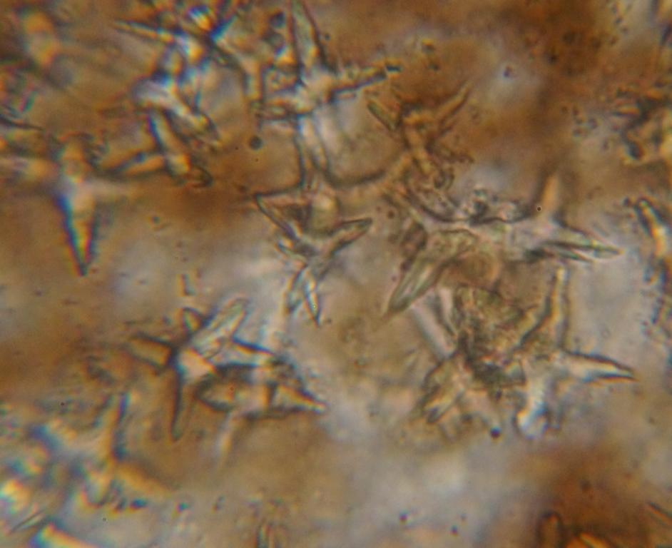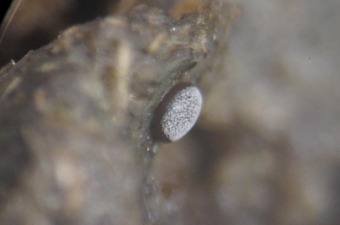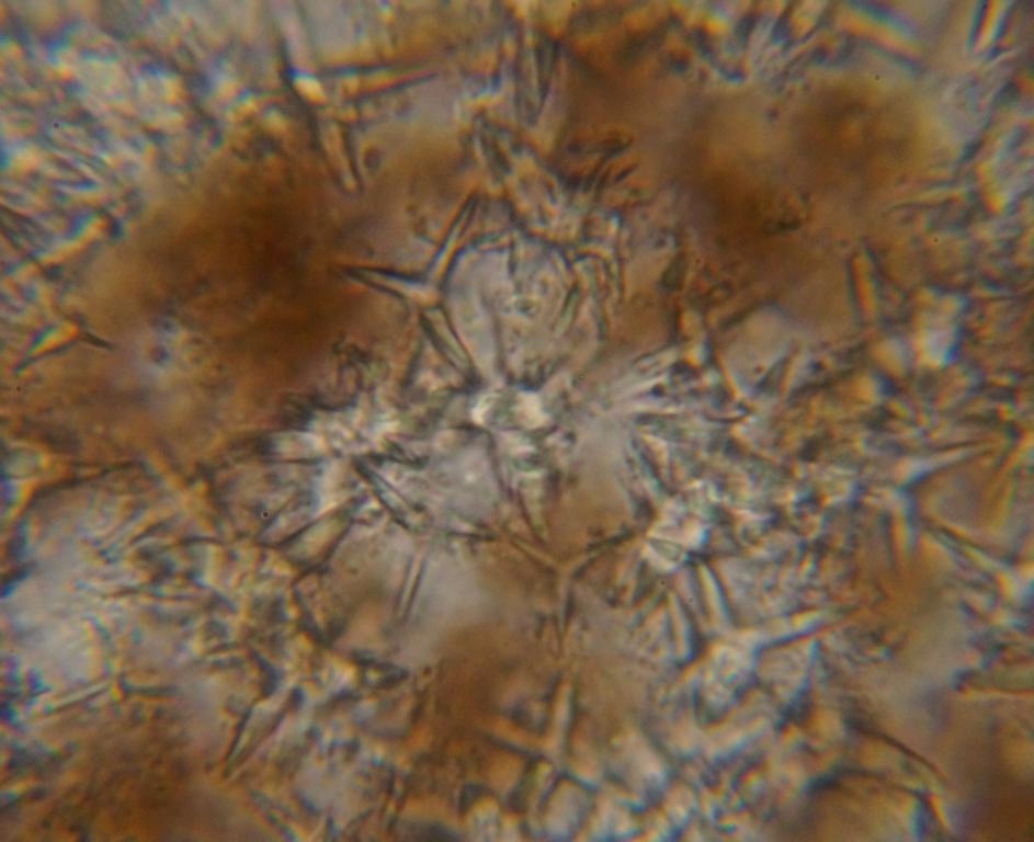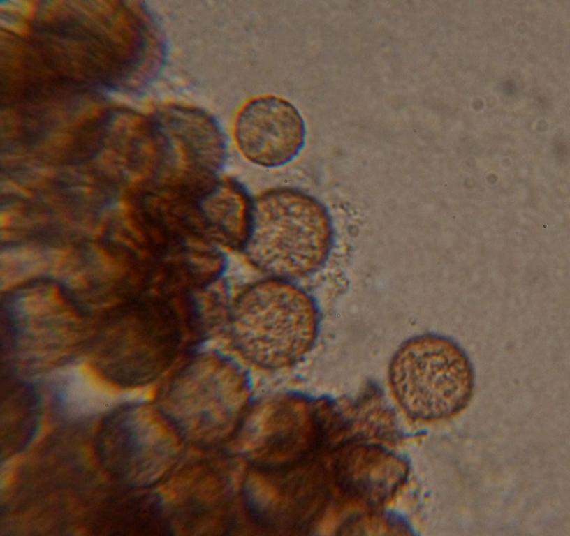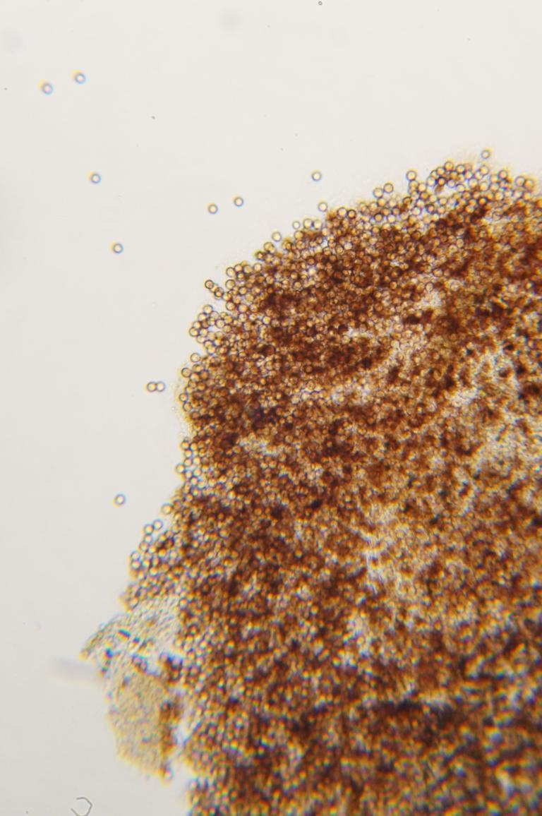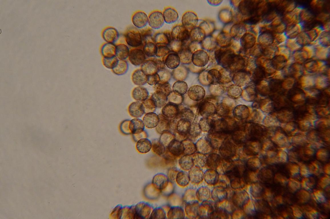 ), und war ca. 1 x 1 mm. Die Sporen messen ca. 10 x 10 µ. Auffällig waren noch sternförmige Elemente im Quetschpräperat. Hat jemand irgend eine Idee was das sein könnte?