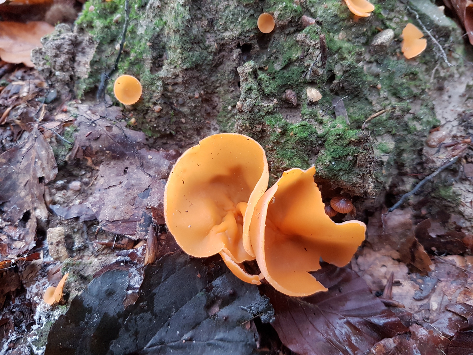 Ich glaube, das ist nicht der Orangebecherling. Links der Kleine sieht außenrum gerändelt aus, und die hirnartigen Falten im Inneren der großen Apos wären mir eine Spur zu ausgeprägt.